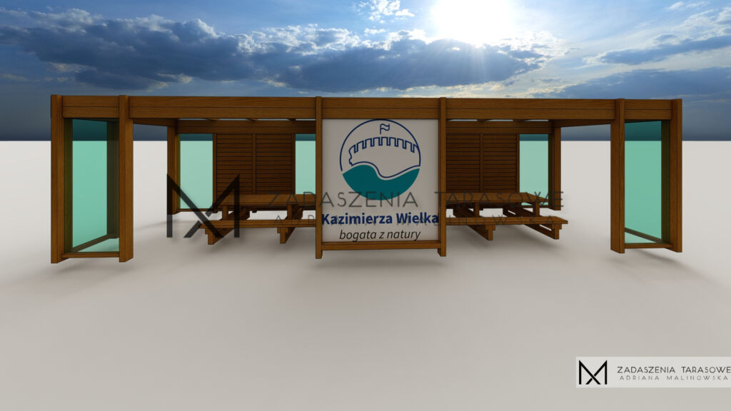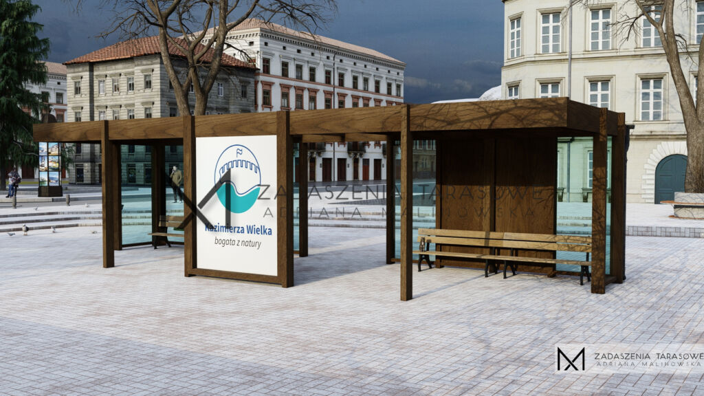 Zamysł wykonania altany dla mieszkańców gminy powstał w związku z koniecznością zapewnienia schronienia przed deszczem, wiatrem i słońcem, osobom oczekującym na połączenia autobusowe. Dodatkowo, altanka ma być miejscem wypoczynkowym w którym mieszkańcy mogą spotkać się ze znajomymi. Projekt zaproponowany przez naszą firmę, spełnił te oczekiwania. Dodatkowym atutem okazała się funkcja reprezentacyjna altany. Zainstalowana w miejscu widocznym w samym centrum Kazimierzy Wielkiej. Jest również ozdobą rynku obok multimedialnej fontanny i ławki „Serca” w którym można wykonać pamiątkowe zdjęcie. W tym miejscu nie mogło być kompromisów i w taki sposób podeszliśmy do tego projektu. Z czterech wersji projektu mieszkańcy wybrali wersję, która zostanie przez naszą firmę wyprodukowana i złożona w terminie do 15 lipca 2023 r. Następnego dnia mają się odbyć dni Kazimierzy Wielkiej i altana zostanie udostępniona.