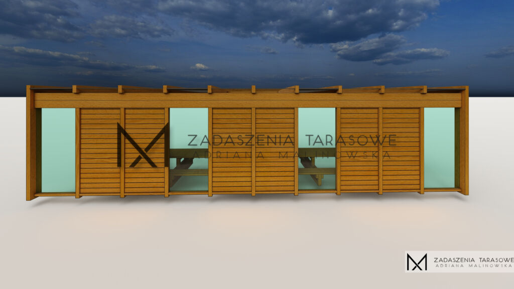 Projekt altany oparty jest o szkieletową konstrukcję drewnianą o wymiarze 11,8 x 4 m. Nowoczesny wygląd konstrukcji uzyskaliśmy stosując opracowane i opatentowane przez nas rozwiązania stylistyczne i montażowe. Wszystkie elementy połączone są w taki sposób aby altana swoim wyglądem przyciągała wzrok.