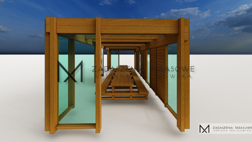 Drugim zastosowanym rodzajem wypełnienia ścian jest szkło bezpieczne hartowane i laminowane 44.2. Na szkle zostały nadrukowane paski ostrzegawcze a zainstalowane zostało również poprzez wklejenie w ramę szkieletu altany.