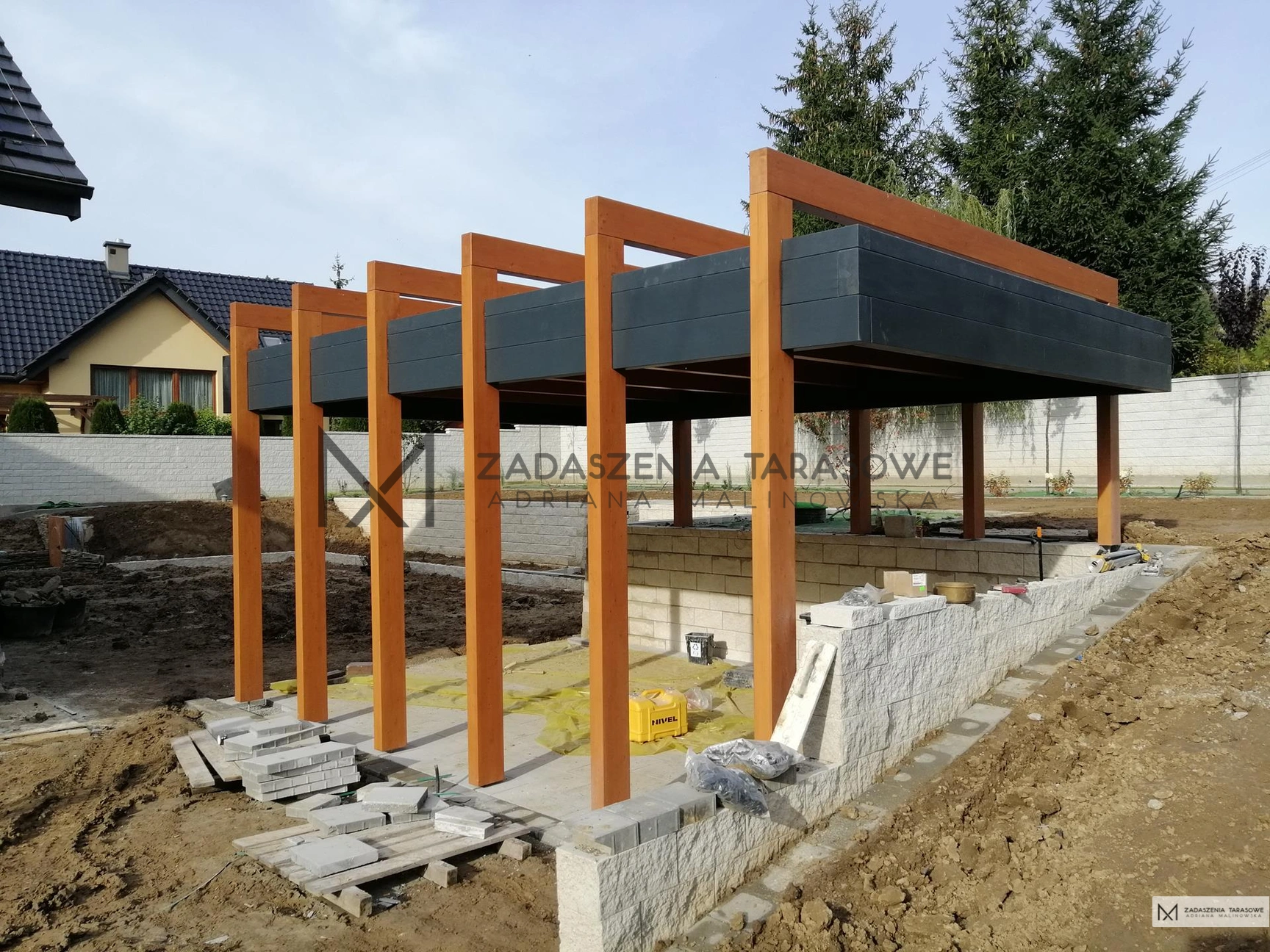 Sam szkielet konstrukcji powstał z drewnianych belek w dwóch kolorach. Pionowe elementy mają stonowany, ciepły odcień orzecha, który w promieniach zachodzącego słońca przybiera wyrazistą nutę pomarańczową. Tymczasem dach wykonany jest z hebanowoczarnych desek. Kolory altany do ogrodu pasują do tonacji głównego budynku. Grafitowa czerń idealnie odwzorowuje odcień dachu, natomiast orzech jest wiernym odzwierciedleniem koloru stolarki okiennej i drzwiowej oraz dekoracyjnych fragmentów elewacji domu.