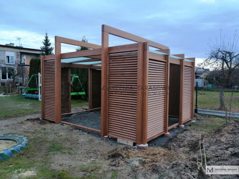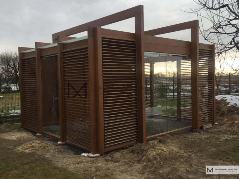 Na tylnej ścianie altany znajduje się pełna zabudowa z wysokiej jakości płyt drewnianych, która nie tylko zwiększa prywatność, ale także dodaje elegancji. Boczne ściany wyposażone są w funkcjonalne żaluzje oraz szkło przesuwne, co pozwala regulować przepływ powietrza i światła według własnych preferencji. Frontowa ściana również jest wyposażona w żaluzje oraz szkło przesuwne, co umożliwia otwarcie altany na zewnątrz lub zamknięcie jej w przypadku niekorzystnych warunków atmosferycznych.