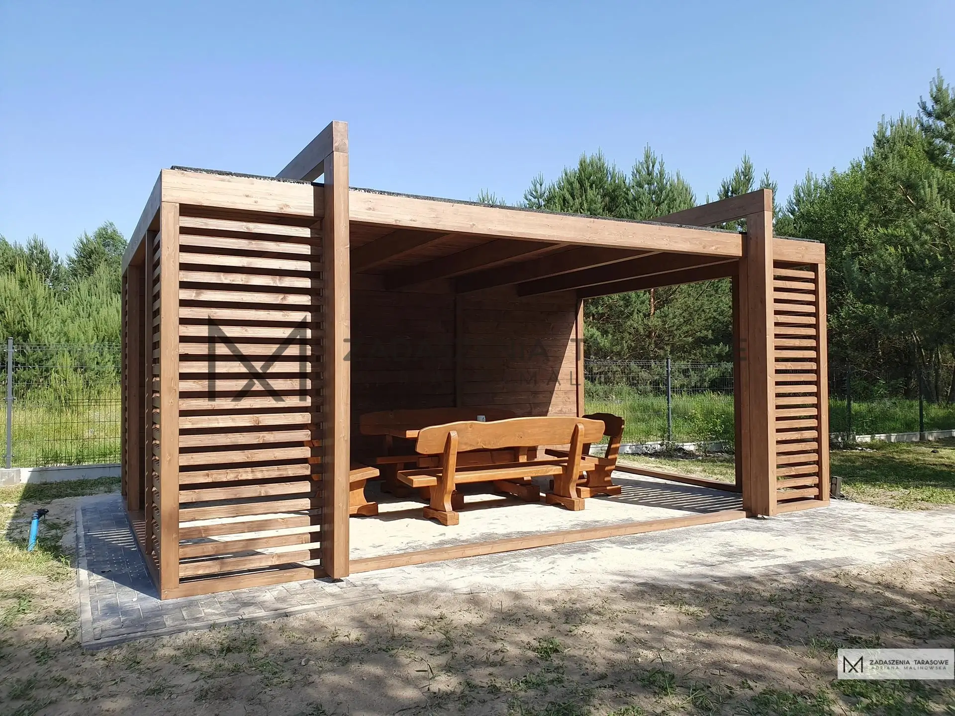 Minimalistyczna konstrukcja jest nowoczesna. Jednak zastosowanie tradycyjnego surowca wprowadza dawkę klasyki do charakteru, jaki ma ta duża altana ogrodowa. W związku z tym projekt oparliśmy na drewnie w wyrazistym odcieniu orzecha. Widoczne sęki i słoje sprawiają, że zabudowa wygląda surowo i naturalnie. Dzięki temu altana na 20 osób nowoczesna idealnie komponuje się z otoczeniem.