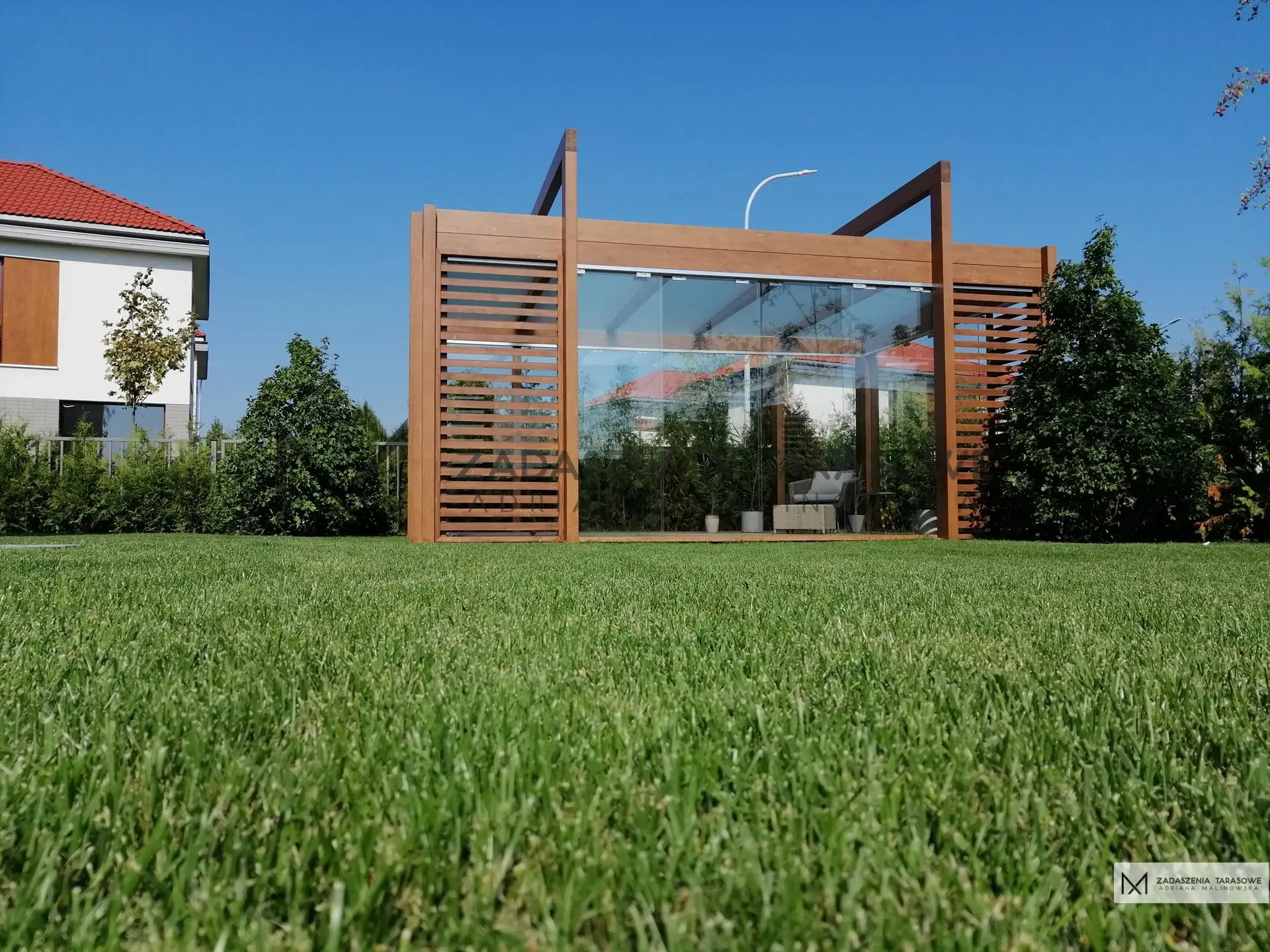 Boki uzupełnione przesuwnymi ekranami wykonanymi z przezroczystego szkła hartowanego mają dużą wartość estetyczną. Dodają zabudowie ponadczasowej elegancji. Wprowadzają nutę luksusu. W rezultacie Altana nowoczesna drewniana ze szkłem zyskuje lekkiego wyglądu.