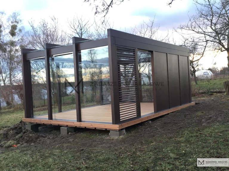 3. Boczne Ściany: Boczne ściany altany różnią się konstrukcją. Prawa ściana ma instalowane stałe i przesuwne szyby, co pozwala na kontrolowanie dostępu światła i widoku. Lewa ściana jest wykonana częściowo z płyty drewnianej i częściowo z żaluzji, co umożliwia regulację widoku i poziomu prywatności.