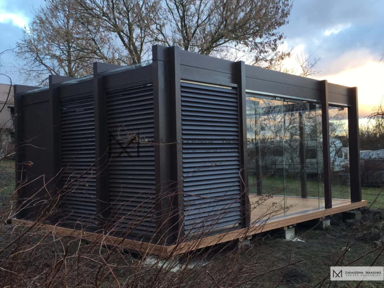 4. Frontowa Ściana: Frontowa ściana altany jest zintegrowana z funkcjonalnymi żaluzjami i przesuwnym szkłem, co pozwala na dostosowanie poziomu ochrony przed słońcem i wiatrem. Ta elastyczność gwarantuje komfort podczas każdej pogody.