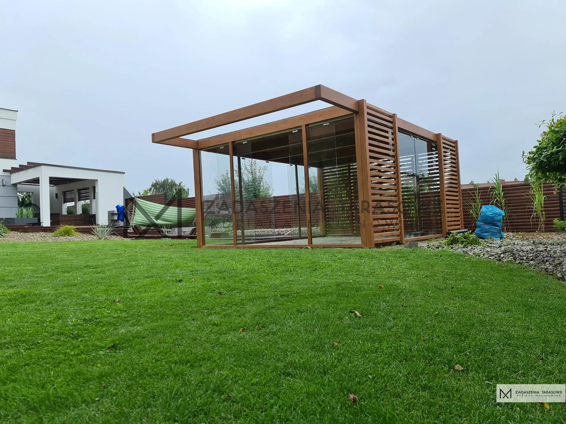 Drewniane elementy uzupełniają przesuwne ekrany wykonane z przezroczystego szkła hartowanego. Zabudowa altany ogrodowej szkłem to zabieg, który nadaje konstrukcji nowoczesności i lekkości, co jest istotnym elementem przy przestronnych projektach.
