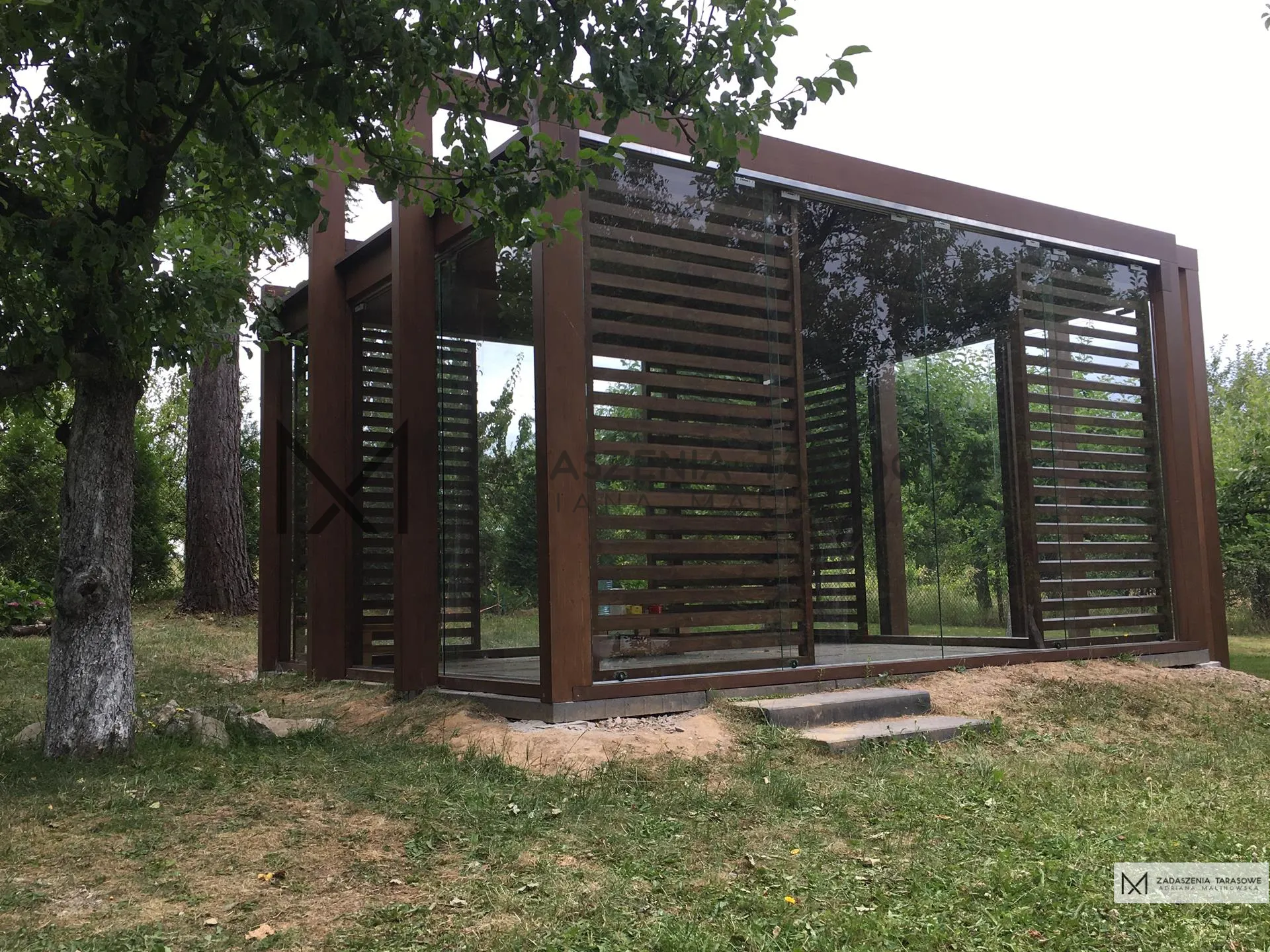 Elementy na prowadnicach można łatwo przesunąć, otwierając wnętrze przy ładnej pogodzie i zamykając w pochmurne i chłodniejsze dni. Szklane ekrany chronią przed deszczem i wiatrem. Dzięki temu altana ogrodowa zamykana nowoczesna jest wykorzystywana od wczesnej wiosny, aż po późną jesień. Boki konstrukcji uzupełniliśmy również ruchomymi panelami drewnianymi z poziomymi ażurami. Pełnią one nie tylko funkcję dekoracyjną. Można je przesuwać na prowadnicach, ustawiając w zależności od położenia słońca. Żaluzje zapewniają delikatny półcień, dzięki czemu altana ogrodowa zamykana nowoczesna ze szkłem i ażurami zapewnia idealne warunki do odpoczynku o każdej porze dnia.