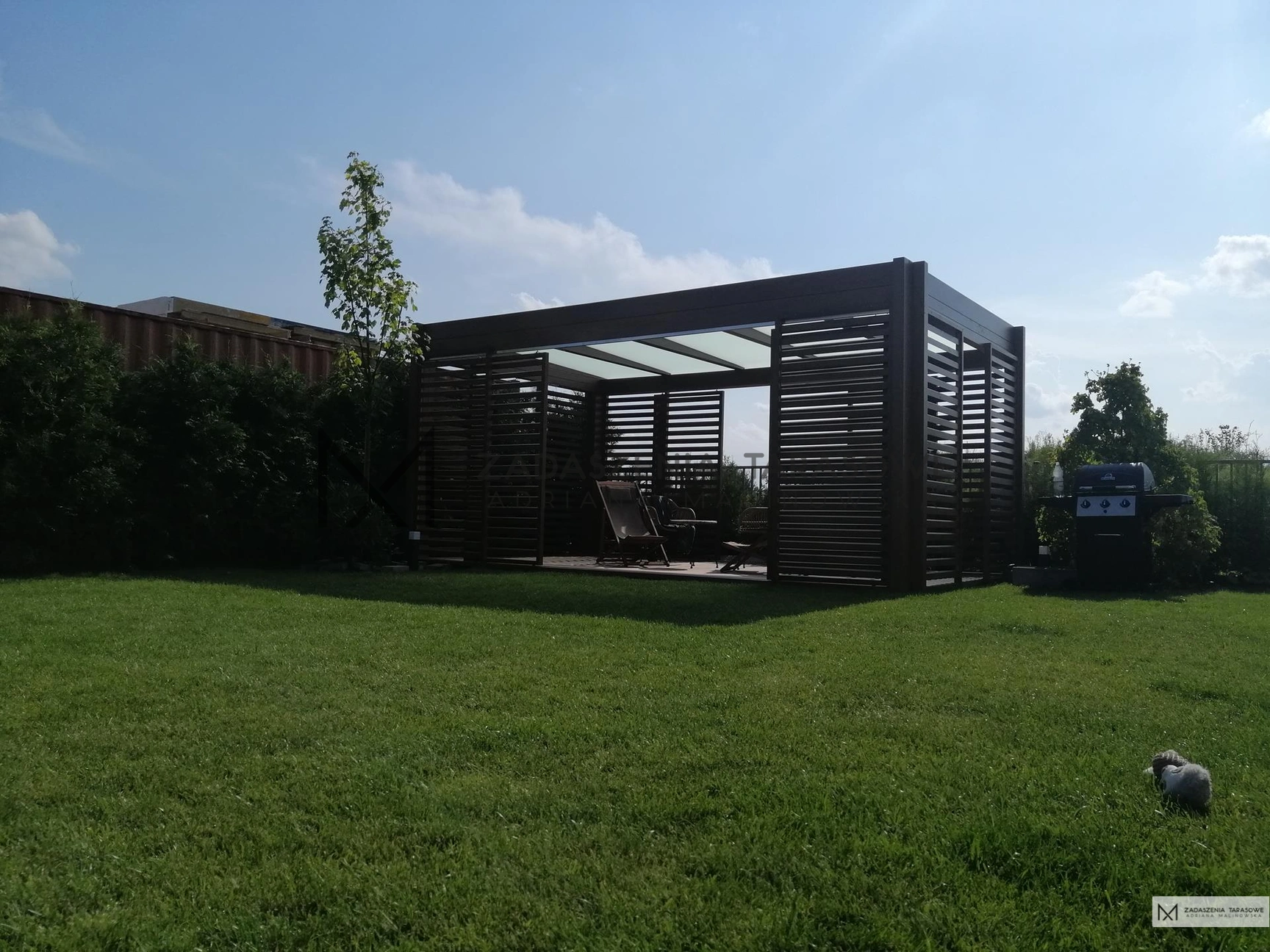 Boki konstrukcji w rogach uzupełnione zostały stałymi panelami z poziomymi deskami. Pełnią one głównie funkcję dekoracyjną. Na dwóch dłuższych ścianach umieszczone zostały dodatkowo po dwa podobne elementy z tą różnicą, że zainstalowaliśmy je w systemie prowadnic. Dzięki temu można je łatwo przesunąć, by zasłonić lub odsłonić wnętrze. Jest to jedno z rozwiązań często stosowanych w konstrukcjach typu nowoczesne altany ogrodowe. Ich zadaniem jest częściowa osłona przed intensywnym słońcem. Dlatego zazwyczaj wykorzystuje się je na bokach wyeksponowanych na stronę południową i zachodnią.