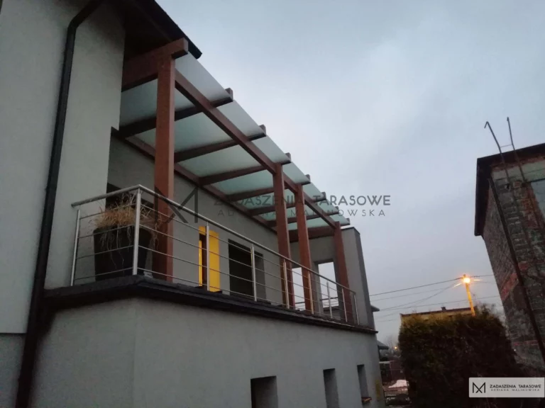 Dach wykonaliśmy z mlecznego szkła hartowanego. Dzięki temu konstrukcja nabiera wizualnej lekkości. Materiał jest trwały i wytrzymały. Odporny na uszkodzenia mechaniczne i zarysowania wytrzyma nawet gradobicie. Poprawia też funkcjonalność takich konstrukcji jak tarasy oraz altany ogrodowe. Nowoczesna zabudowa jest osłoną przed południowym, palącym słońcem, gdyż mleczne zadaszenie absorbuje część promieni słonecznych. Wprowadza do środka delikatny, przyjemny półcień, dający wytchnienie od upału. Chroni też przed delikatnym deszczem. Dzięki temu altana prosta nowoczesna może być użytkowana nie tylko w słoneczne dni. Będzie też idealnym miejscem relaksu przy nieco gorszej aurze.