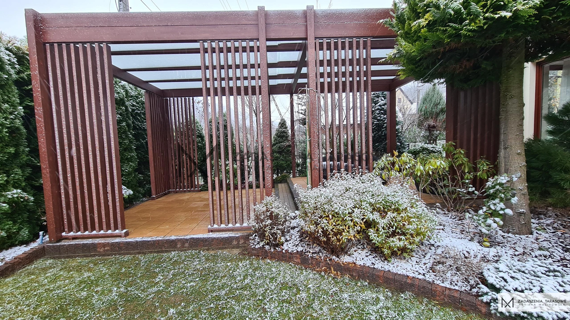 Szkielet konstrukcji powstał z drewnianych belek w wyrazistym, czerwono-brązowym odcieniu mahoniu, który komponuje się z naturalną aranżacją ogrodu. Altana z lamelami w charakter przestrzeni wpisuje się także kontrastowe usłojenie i widoczne sęki, które nadają elementom drewnianym surowego wyglądu. Efekt ten udało nam się osiągnąć poprzez ręczne szczotkowanie każdej części osobno, co było najtrudniejszym i najbardziej czasochłonnym etapem tworzenia tej nowoczesnej altany z lamelami. Jednak efekt był tego wart. Zabudowa zyskała tradycyjnego, przytulnego uroku, pozostając jednocześnie nowoczesna i elegancka.