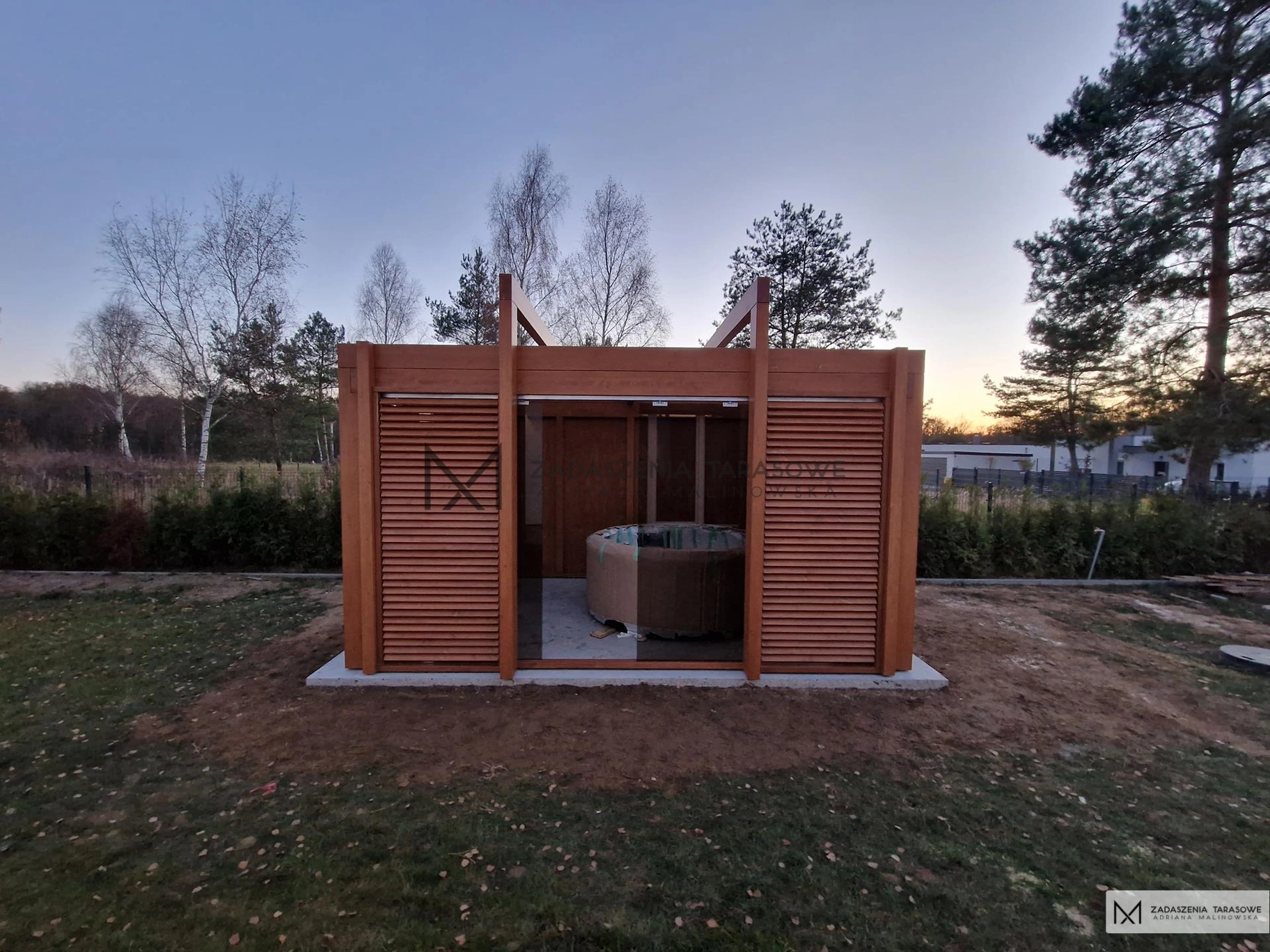 Altana ogrodowa została w pełni zabudowana. Po bokach, w rogach konstrukcji znajdują się drewniane panele z poziomymi deseczkami. System pozwala na ich zamknięcie lub otworzenie. Jest to klasyczne rozwiązanie zaczerpnięte z domowych żaluzji. Zapewnia właścicielom całkowitą prywatność podczas relaksujących chwil w jacuzzi.