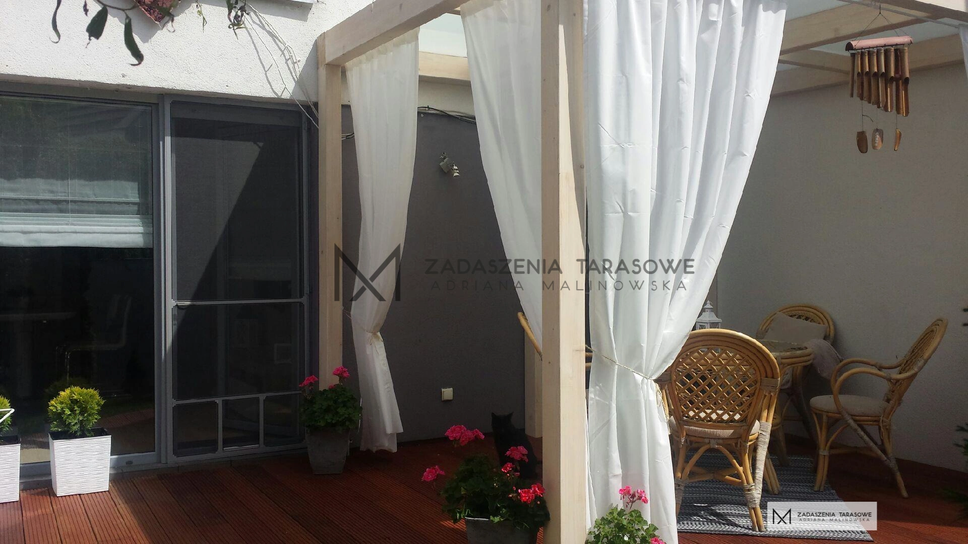 Materiał stanowi dodatkową osłonę przed słońcem, a także przed delikatnym wiatrem. Można go rozwinąć, zasłaniając taras lub zawiązać przy belkach konstrukcyjnych, tworząc ciekawą, elegancką i nieco romantyczną ozdobę.