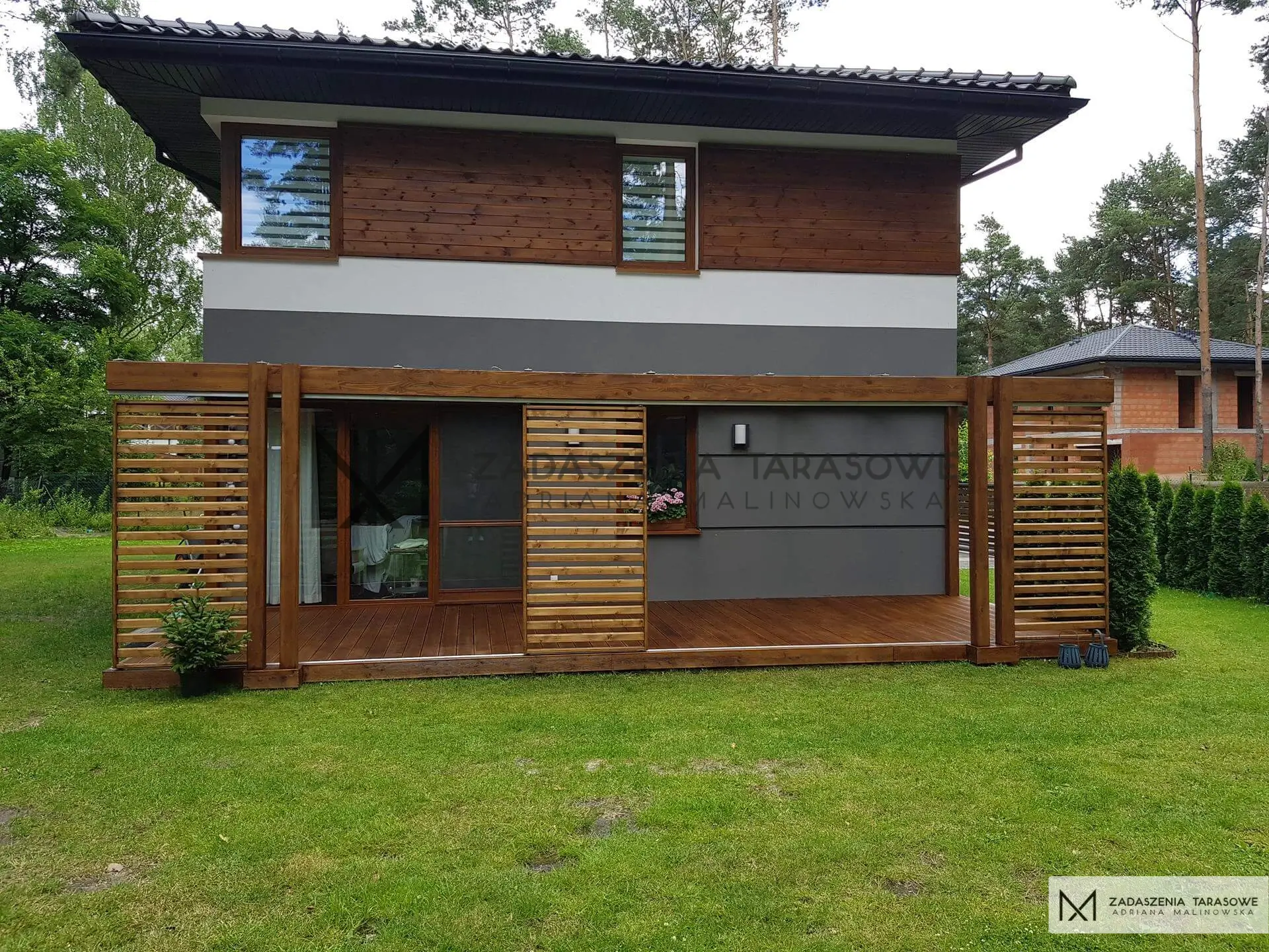 Zaprojektowanie zadaszenia tarasu na wymiar pozwoliło dopasować jego wielkość do wymiarów budynku. Konstrukcja wykonana z drewna w intensywnym kolorze ciemnego orzecha z wyraźnie zaznaczonymi sękami. Taka struktura doskonale komponuje się z naturalnym otoczeniem posesji. Barwa natomiast dopasowana została do stolarki okiennej. Dzięki temu tworzą spójną i estetyczną aranżację.