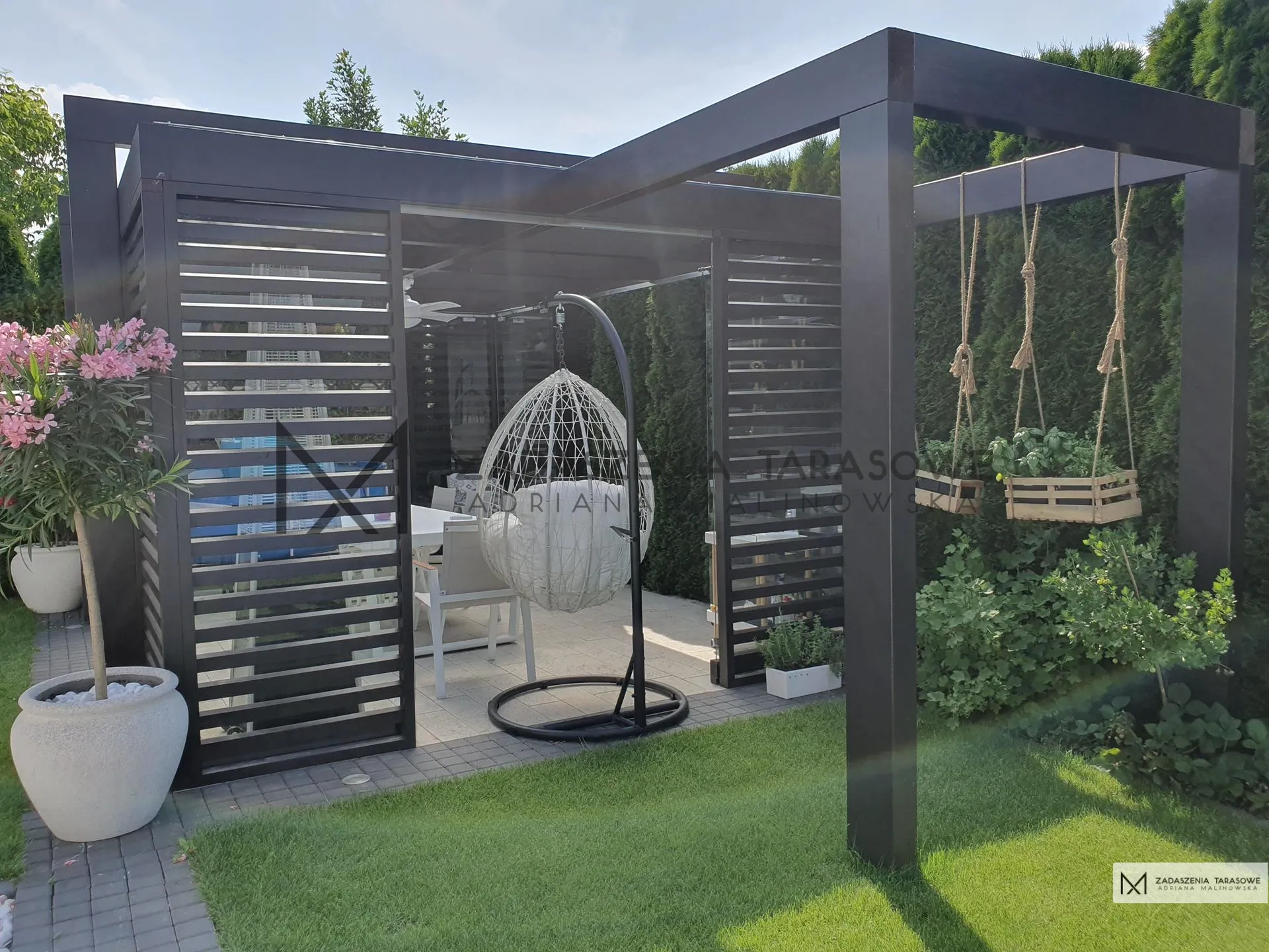 Właściciele tej nieruchomości marzyli o eleganckim miejscu zarówno do relaksu w ciszy, jak i do gwarnych spotkań z przyjaciółmi przy grillu, którego są fanami. Ich oczekiwania spełniła altana ogrodowa z płaskim dachem. Projekt przewidywał stworzenie przestronnej konstrukcji zlokalizowanej przy granicy posesji. Dzięki temu soczyście zielony żywopłot okala dwa boki konstrukcji, będąc jej naturalną ozdobą. Nowoczesna altana ogrodowa 4×6 doskonale wpisała się we współczesną aranżację ogrodu oraz prostą, geometryczną kubaturę domu. Oddała także kolorystykę dominującą na posesji.