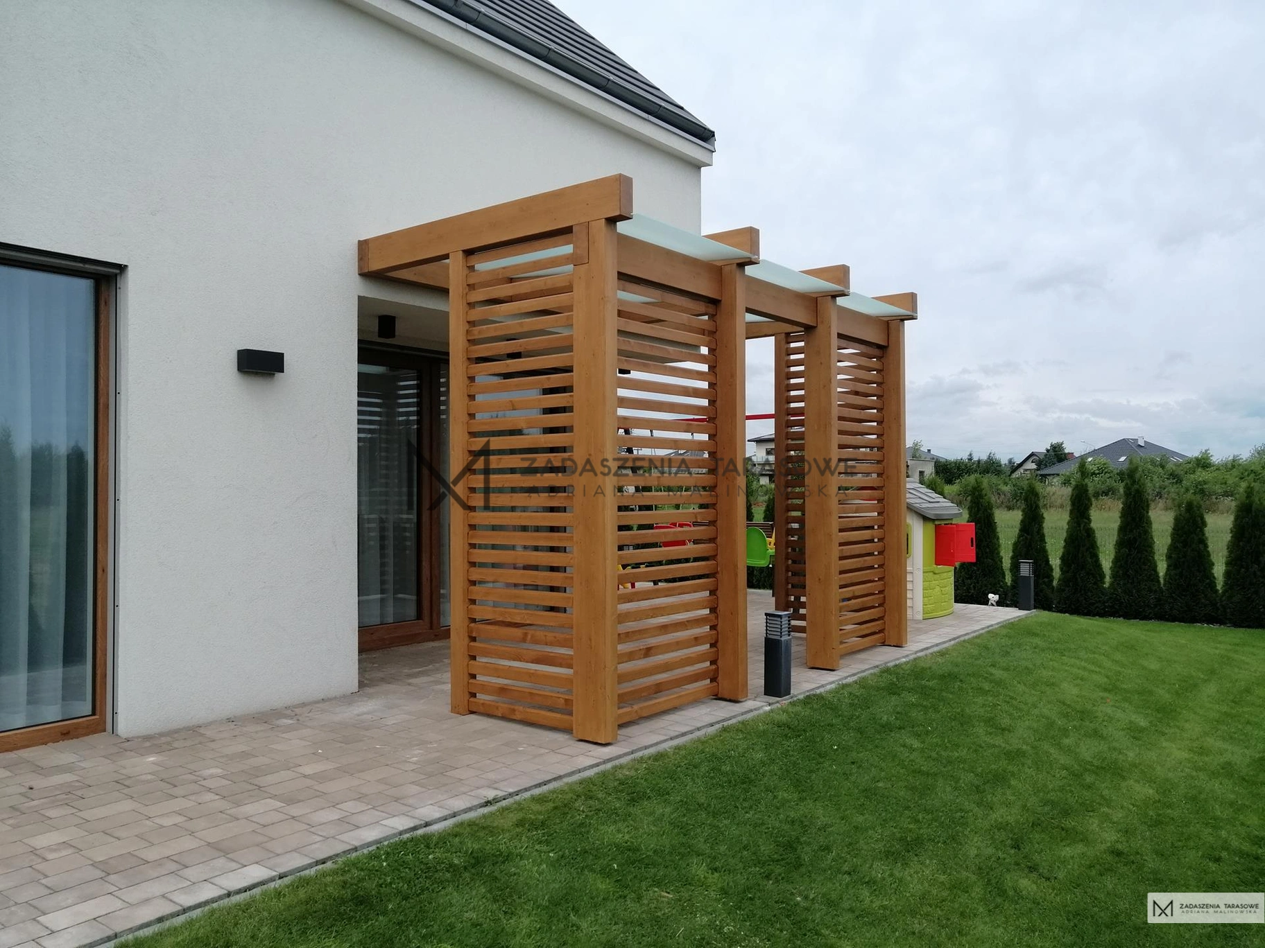 Zabudowę po bokach uzupełniają stałe panele z poziomymi deseczkami. Wykonane są z drewna w tym samym kolorze co szkielet. W niektórych zabudowach stosujemy dwa kolory drewna, jednak zazwyczaj są to przestronne konstrukcje. Małe nowoczesne zadaszenie w jednym kolorze jest lepszym rozwiązaniem. Spójne i eleganckie, nie dominuje nad całą aranżacją przestrzeni.