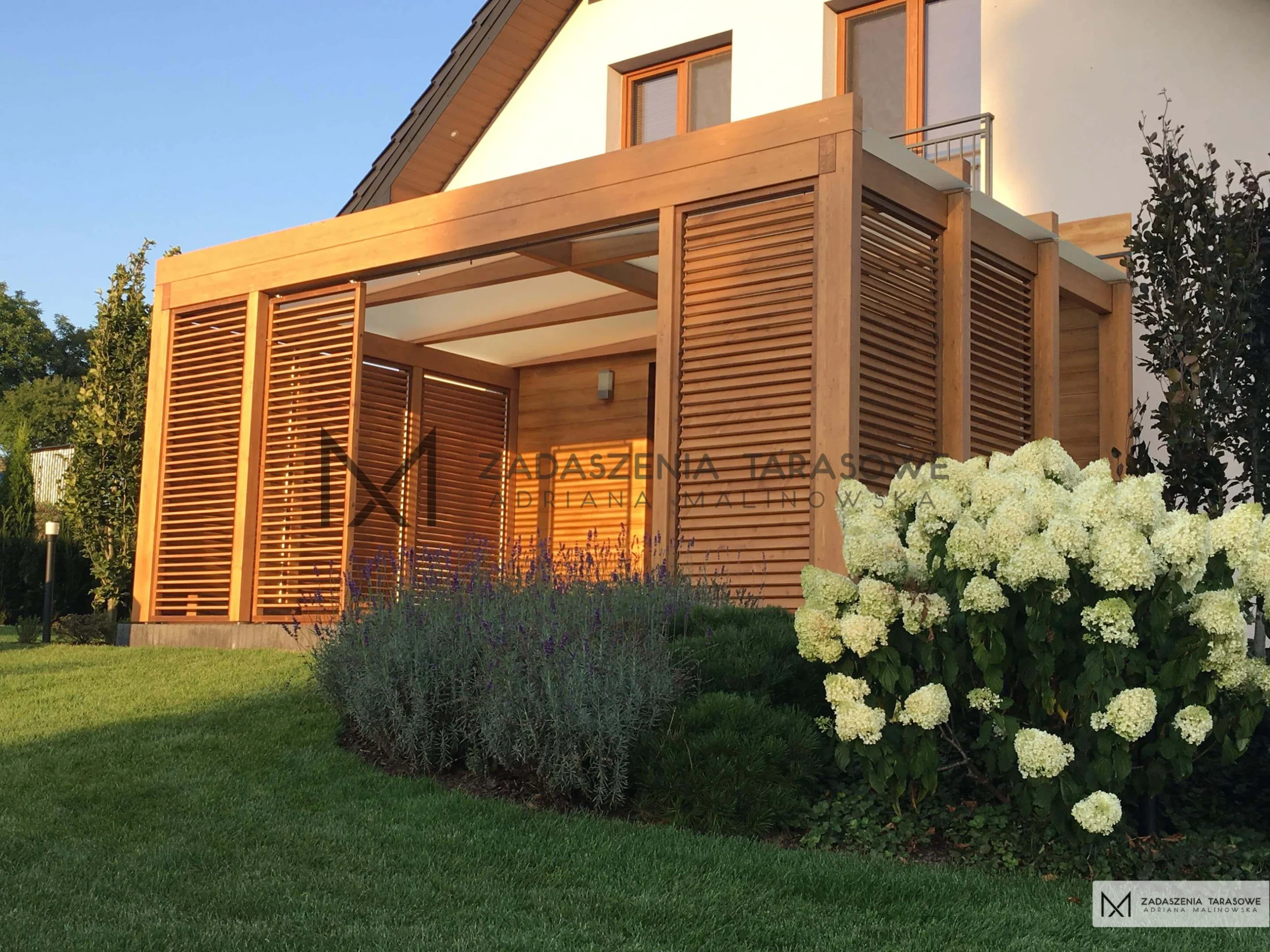 Przy projektowaniu tarasu zwracaliśmy uwagę na jego funkcjonalność. W ścianach bocznych zamontowane zostały żaluzje, które nie tylko zapewniają prywatność, ale także pozwalają kontrolować ilość światła wpadającego na taras. System żaluzji został przez nas specjalnie zaprojektowany i dostosowany do potrzeb tego tarasu. Na frontowej ścianie umieszczone zostały żaluzje stałe i przesuwne, dzięki którym taras można osłonić przed słońcem późnym popołudniem, co sprawia, że jest on idealnym miejscem na wieczorne spotkania.