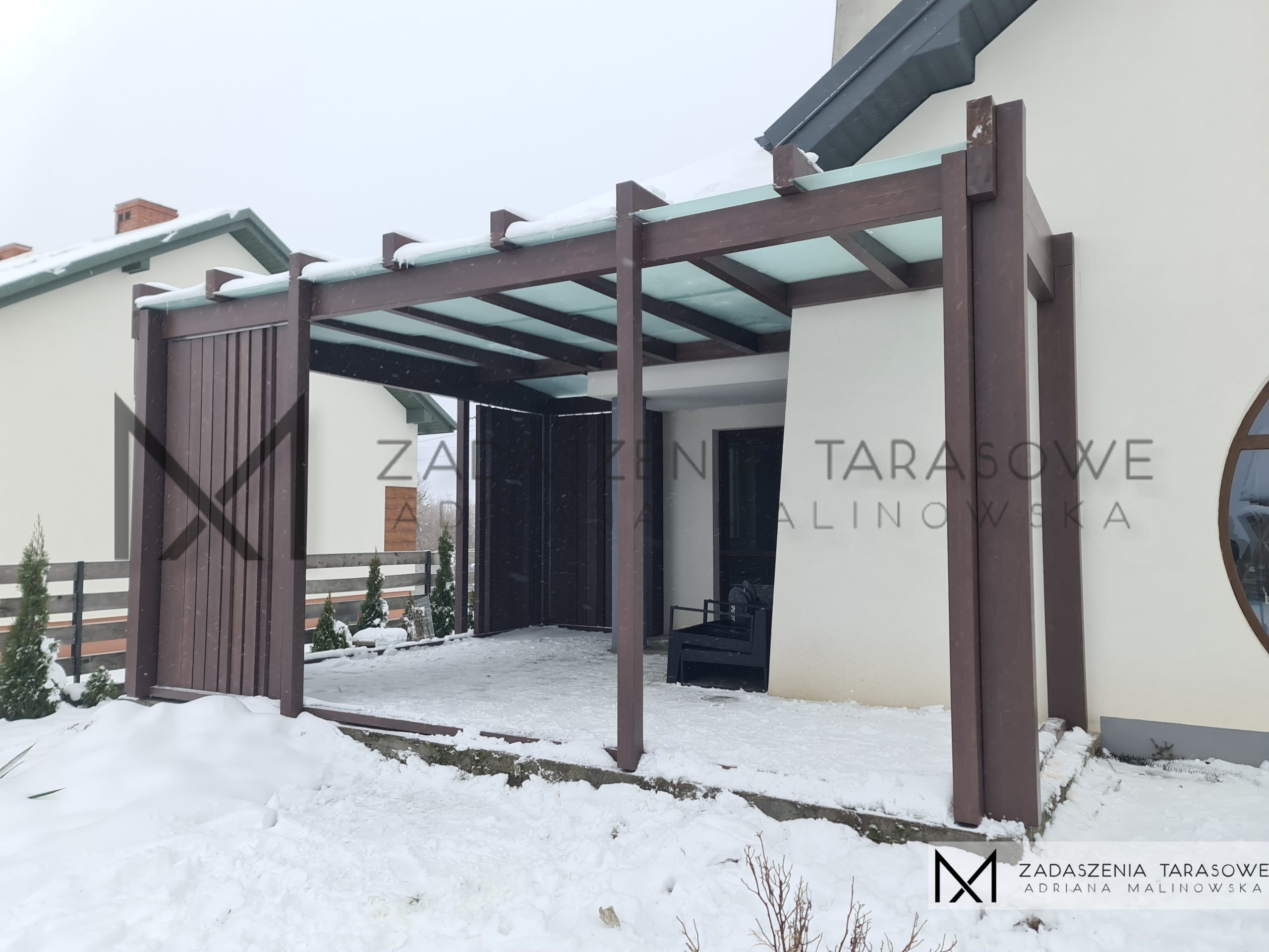 Na dachu tarasu zamontowane zostało szkło bezpieczne mleczne w opatentowanym przez Zadaszenia Tarasowe Adriana Malinowska systemie. Ten szczelny system nie tylko doskonale zabezpiecza przed warunkami atmosferycznymi, ale także podnosi stabilność całej konstrukcji, sprawiając, że jest ona trwała i niezawodna.