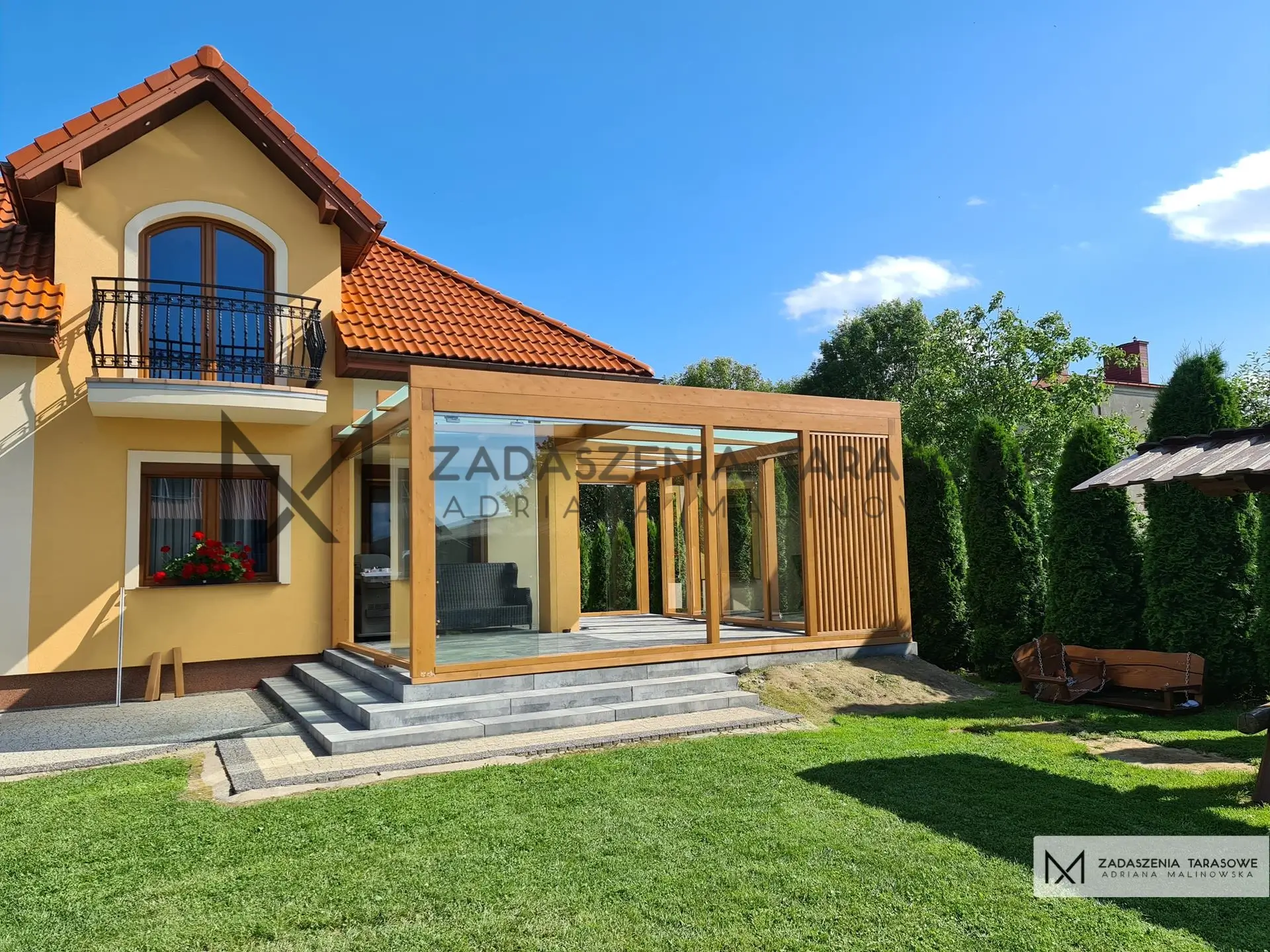 Narożny taras z pergolami – szkło przeźroczyste w ścianach