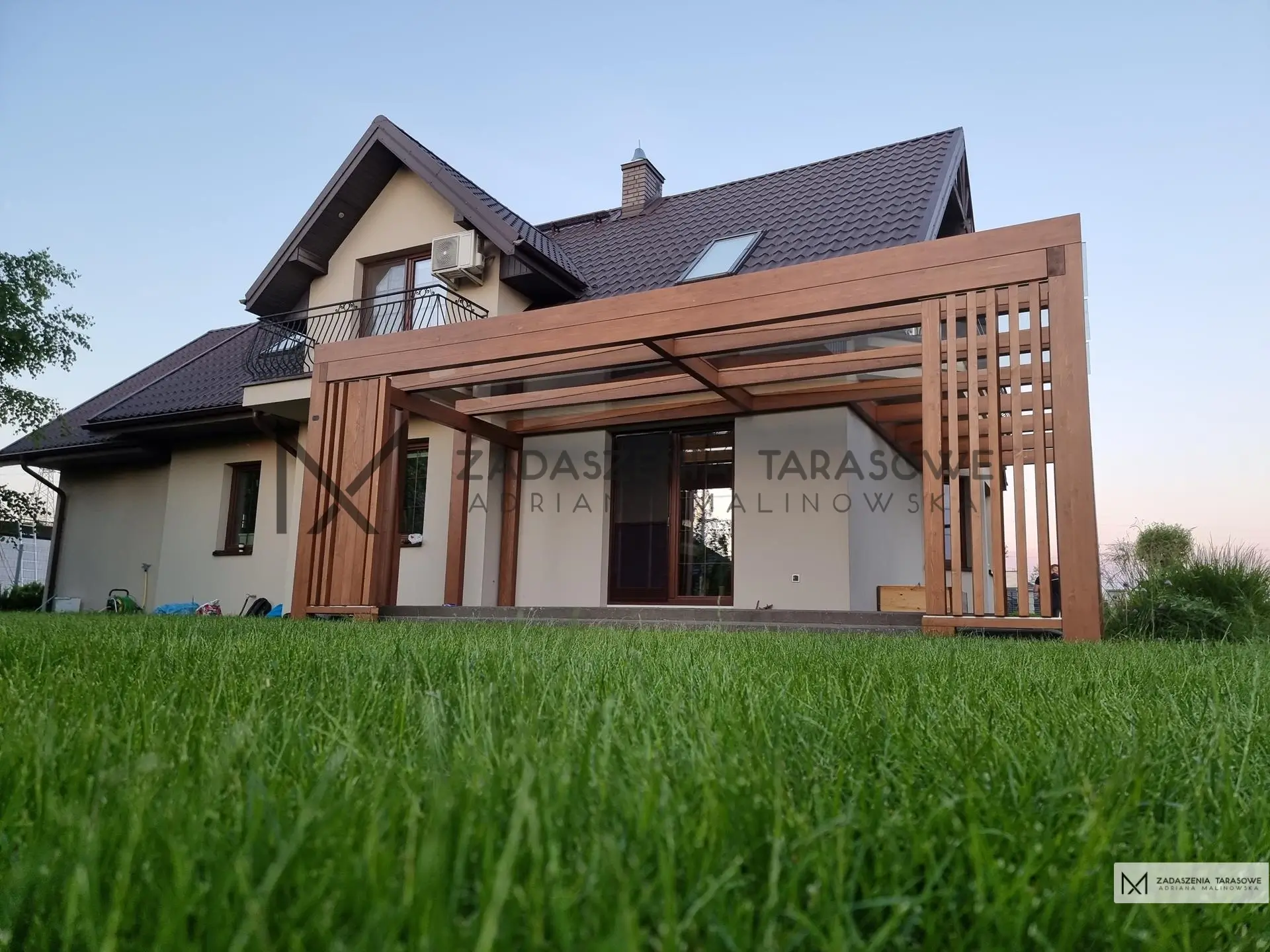 Konstrukcja zadaszenia w kolorze złoty dąb  Zadaszenie tarasów pergola.