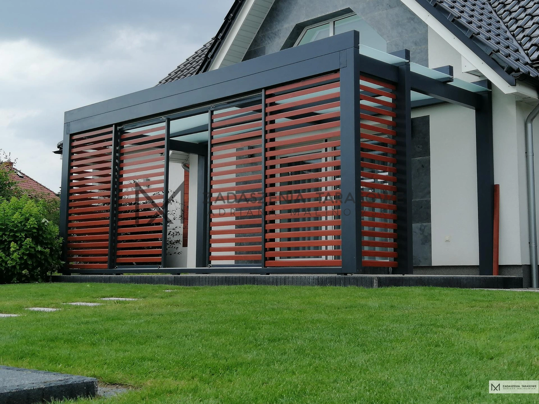 Poziome deski z drewna w ciepłym kolorze orzecha, który współgra z elementami dekoracyjnymi elewacji budynku. W ten sposób to tarasowe zadaszenie nowoczesne doskonale wpisuje się w charakter domu, stając się jego integralną częścią.