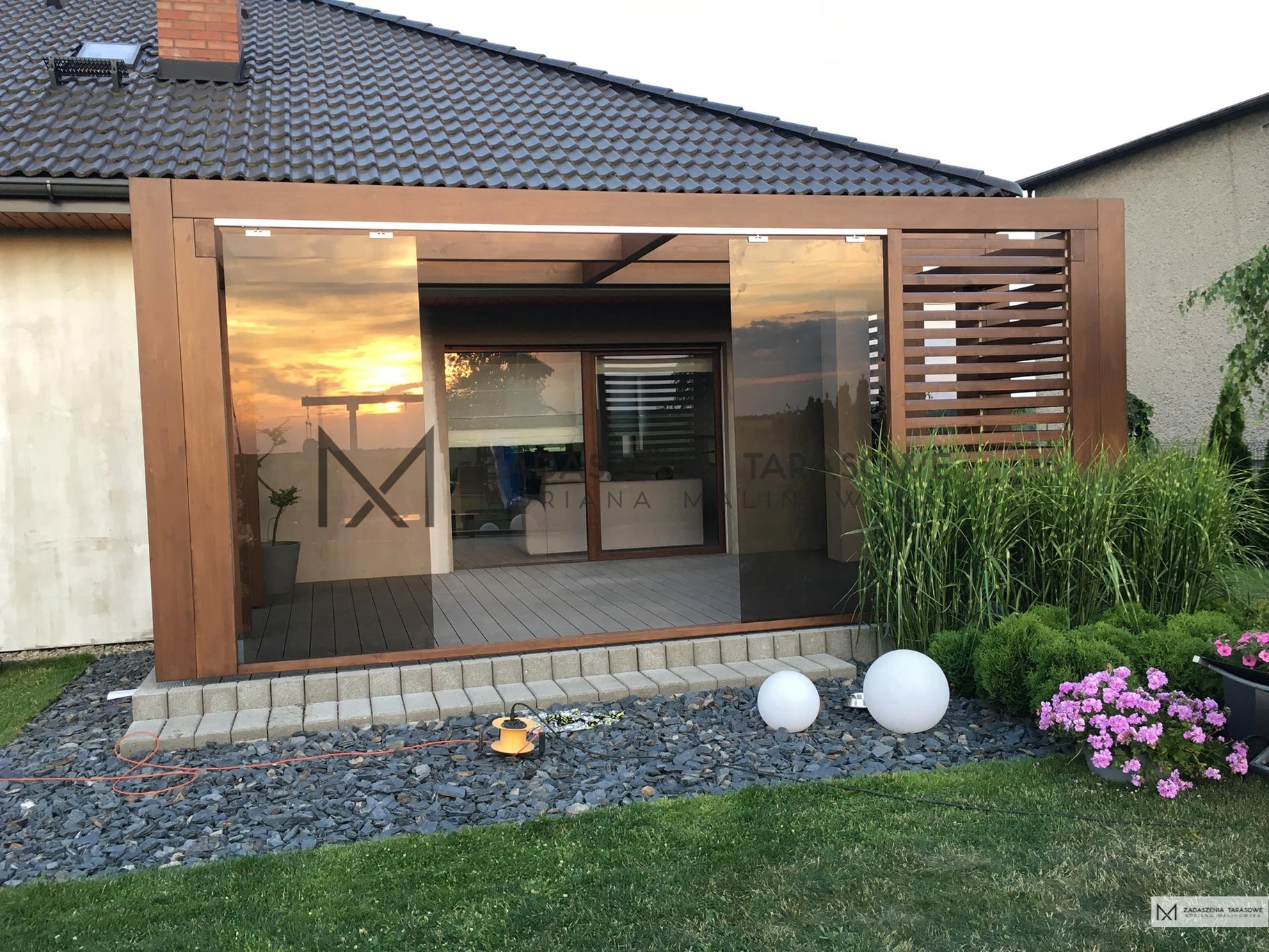 Jeden taki panel znajduje się też na froncie zabudowy. Pełni funkcję głównie dekoracyjną. Pozostałą część tej ściany wypełniają ruchome elementy wykonane z brązowego szkła hartowanego. Dzięki nim nowoczesne zadaszenie ogrodowe zyskuje elegancję oraz funkcjonalność. Ciemne szkło chroni przed promieniami zachodzącego słońca. Działa niczym okulary przeciwsłoneczne. Wnętrze nie nagrzewa się popołudniami, kiedy właściciele najchętniej i najczęściej korzystają z ogrodu. Panele szklane przesuwają się na prowadnicach, co zwiększa funkcjonalność takiej zabudowy, jak to nowoczesne zadaszenie w ogrodzie. Śląsk jest regionem, w którym często mamy przyjemność pracować. W tym wypadku zrealizowaliśmy ciekawą, absolutnie nowoczesną konstrukcję, która fenomenalnie organizuje elegancką przestrzeń wokół domu, stanowiąc jednocześnie uzupełnienie aranżacji.