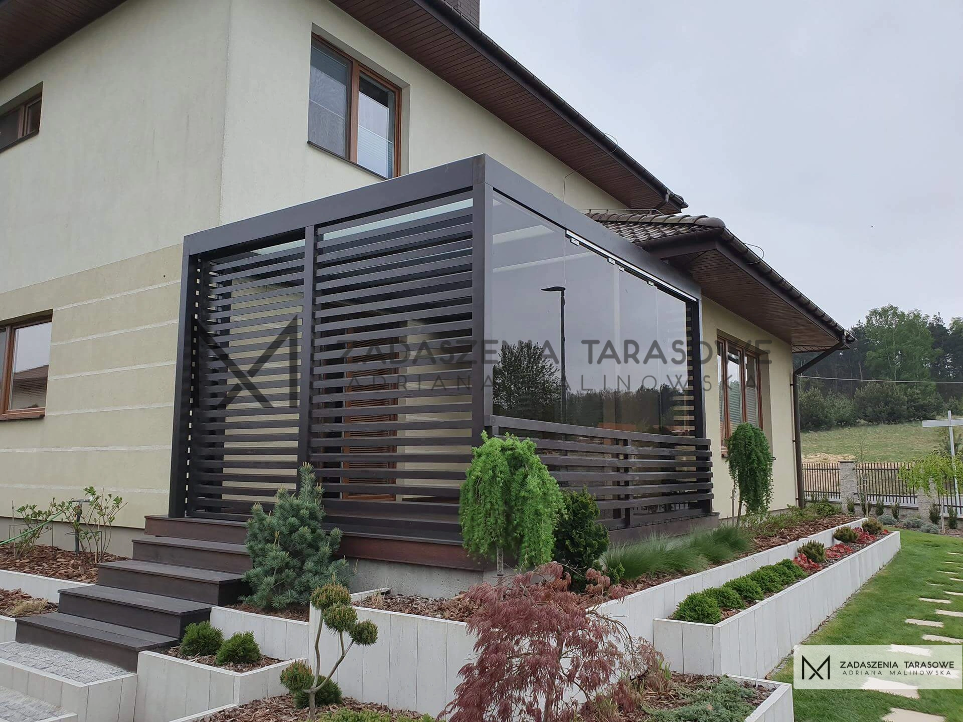 Akcentem dekoracyjnym jest drewniana balustrada, która ogranicza taras z jednego boku. Rozwiązanie to ma także swoją stronę praktyczną. Zabudowa jest miejscem zabawy kilkuletnich dzieci. Nowoczesny taras w szkle z balustradą zapewnia im optymalny stopień ochrony przed ewentualnym upadkiem przy odsłoniętych elementach szklanych. Drugi bok nieprzylegający do budynku wypełniony został jednym stałym i jednym ruchomym panelem, który pełni funkcję drzwi. Poziome żaluzje zapewniają cyrkulację powietrza. Wszystkie elementy konstrukcji tego nowoczesnego tarasu w szkle z balustradą pokryte zostały laminatem w tym samym, grafitowym odcieniu. Ważnym elementem konstrukcji są przeszklenia.