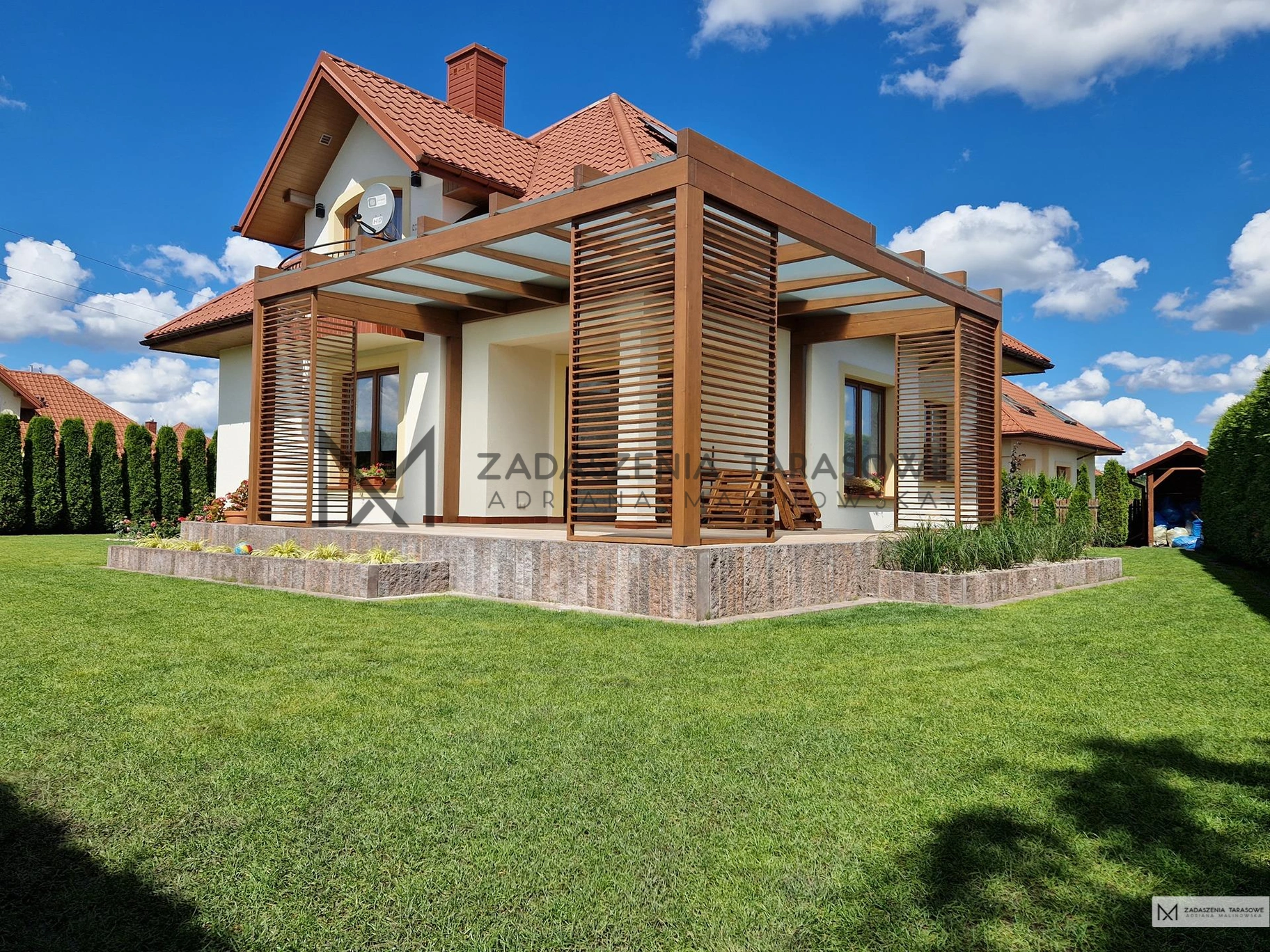 Projekt tego zadaszenia był mocno rozwojowy, zaczęliśmy od wykonania narożnej pergoli. Zrobiliśmy z niej zadaszenie tarasu narożnego a następnie zabudowaliśmy ściany shuttersami. W przyszłości będzie dalsza zabudowa ścian. Wszystko jest możliwe, dzięki zastosowaniu niewidocznych systemów montażu, oraz pełnej dowolności konstrukcyjnej.
