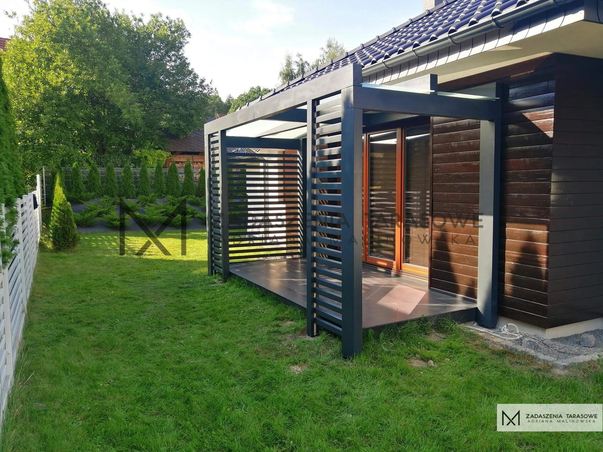 Taras zewnętrzny zadaszony uzupełniony stałymi panelami. Te drewniane elementy do zabudowy zadaszenia tarasu umieszczone od frontu pełnią rolę dekoracyjną. Natomiast te, które pokrywają jeden bok, chronią przed zachodzącym słońcem, gdyż na tę stronę wyeksponowany jest taras. Wprowadzają delikatny cień, umożliwiając relaks w godzinach, gdy rodzina najbardziej go potrzebuje. Punkt kulminacyjny konstrukcji to dach ze mlecznego szkła hartowanego. Taras ze szkłem zyskuje na swojej funkcjonalności. Wpuszcza światło, a jednocześnie absorbuje promienie, chroniąc przed nagrzaniem. Umożliwia odpoczynek w godzinach największej operacji słońca. Chroni przed deszczem zarówno właścicieli, jak i meble ogrodowe.