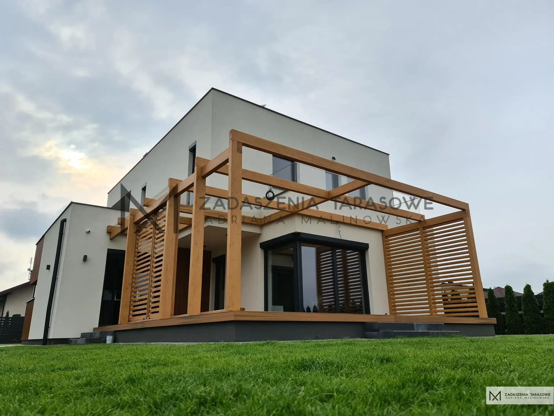 Pergole na taras nie muszą idealnie współgrać z designem domu. Wręcz przeciwnie. Mogą być od niego zupełnie różne. Takie zestawienie bywa nietuzinkowe i zastanawiające. Jest ciekawą kompilacją kontrastów, a przecież przeciwieństwa się przyciągają. Taką właśnie formę ma ta pergola na taras z kompozytu. Dom o prostym kształcie i minimalistycznej kolorystyce przełamany  zabudową z drewna, która jest pomostem pomiędzy tradycją a współczesnością.