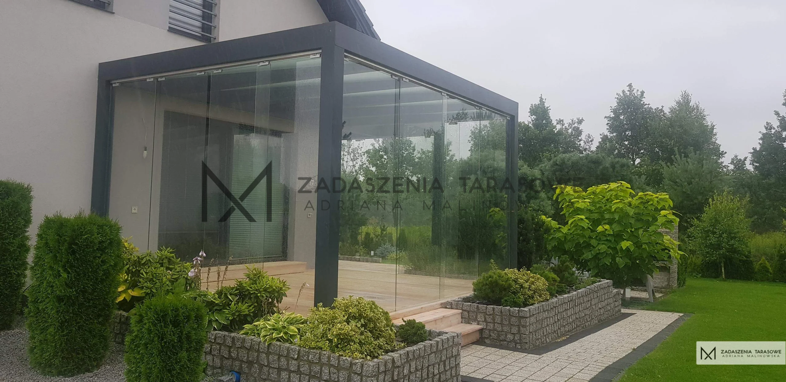 Drewniany szkielet jest oparciem dla szkła, które wypełnia to podwójne zadaszenie tarasu szare. Pergola całkowicie zamknięta może być użytkowana niemal przez cały rok. Wykorzystaliśmy ruchome panele wykonane z przezroczystego szkła hartowanego. Elementy umieszczone na prowadnicach można bez problemu przesuwać, otwierając lub zamykając przestrzeń, by dopasować ją do warunków pogodowych. Podwójne zadaszenie tarasu ze szkłem chroni przed deszczem oraz chłodem. Przy lekkich mrozach wnętrze można ogrzać przenośnym piecykiem elektrycznym lub gazowym.