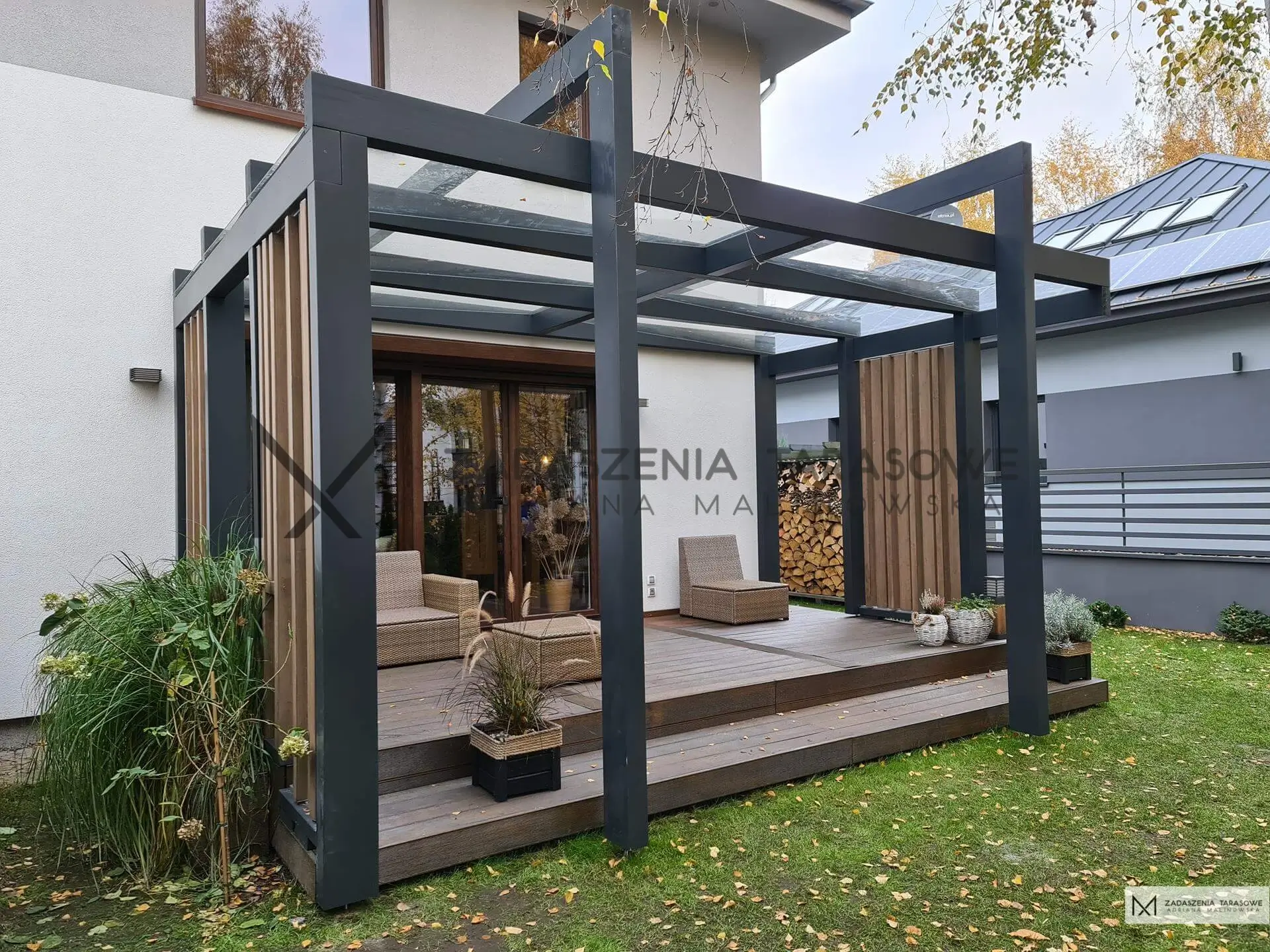 Zamiast lamel można użyć żaluzji, tak zrobiliśmy w projekcie Narożna pergola nowoczesna.