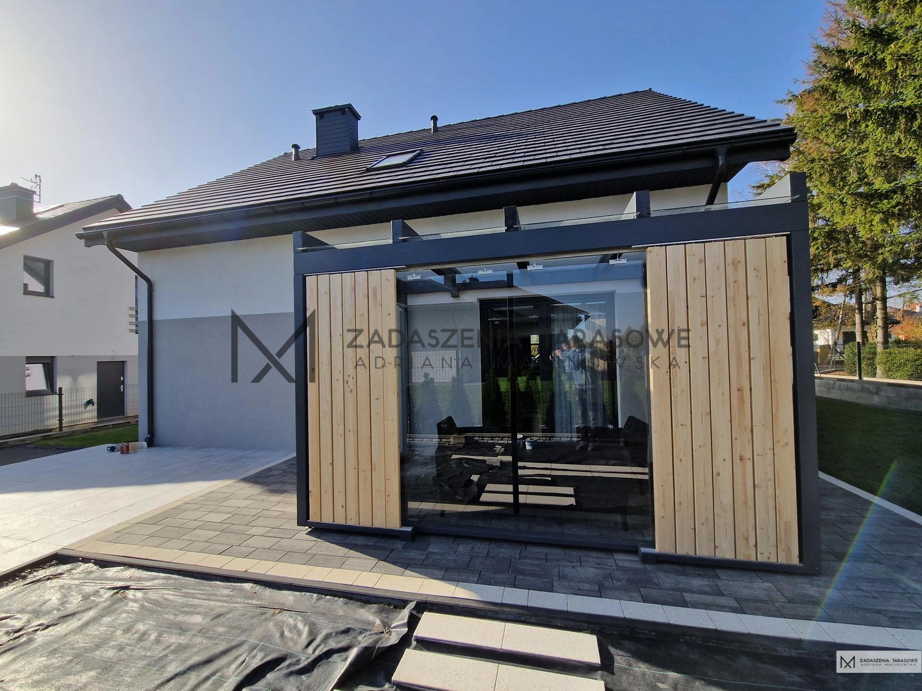 Taras drewniane zadaszenie – Szkło w zabudowie ścian.
