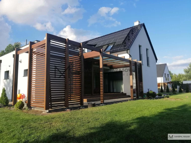 Dwukolorowe zadaszenie tarasu zrobione w innej tonacji kolorystycznej można zobaczyć w projekcie Zadaszenia tarasowe nowoczesne.