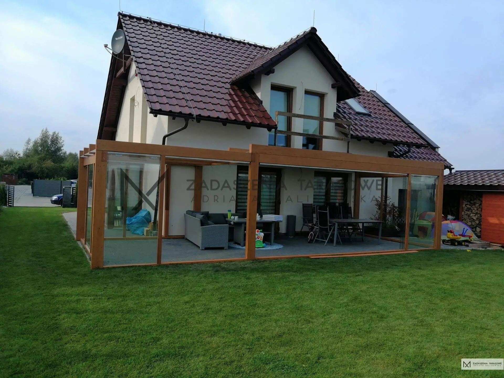Szkielet wykonany został z drewna w kolorze jasnego orzecha. Barwa jest intensywna, ale nie dominuje w całym projekcie. Wszystko za sprawą rozmiarów, jakie ma to zadaszenie na taras rozsuwane. “Wysunęliśmy” go nieco poza ścianę budynku. Dzięki temu właściciele zyskali kilka metrów kwadratowych dodatkowej przestrzeni, a taras z drewnianym zadaszeniem stał się przestronnym pokojem o funkcji jadalni i salonu. Kolumny pełnią rolę nie tylko nośną, ale też dekoracyjną. Głównym elementem konstrukcji jest bowiem transparentne szkło.