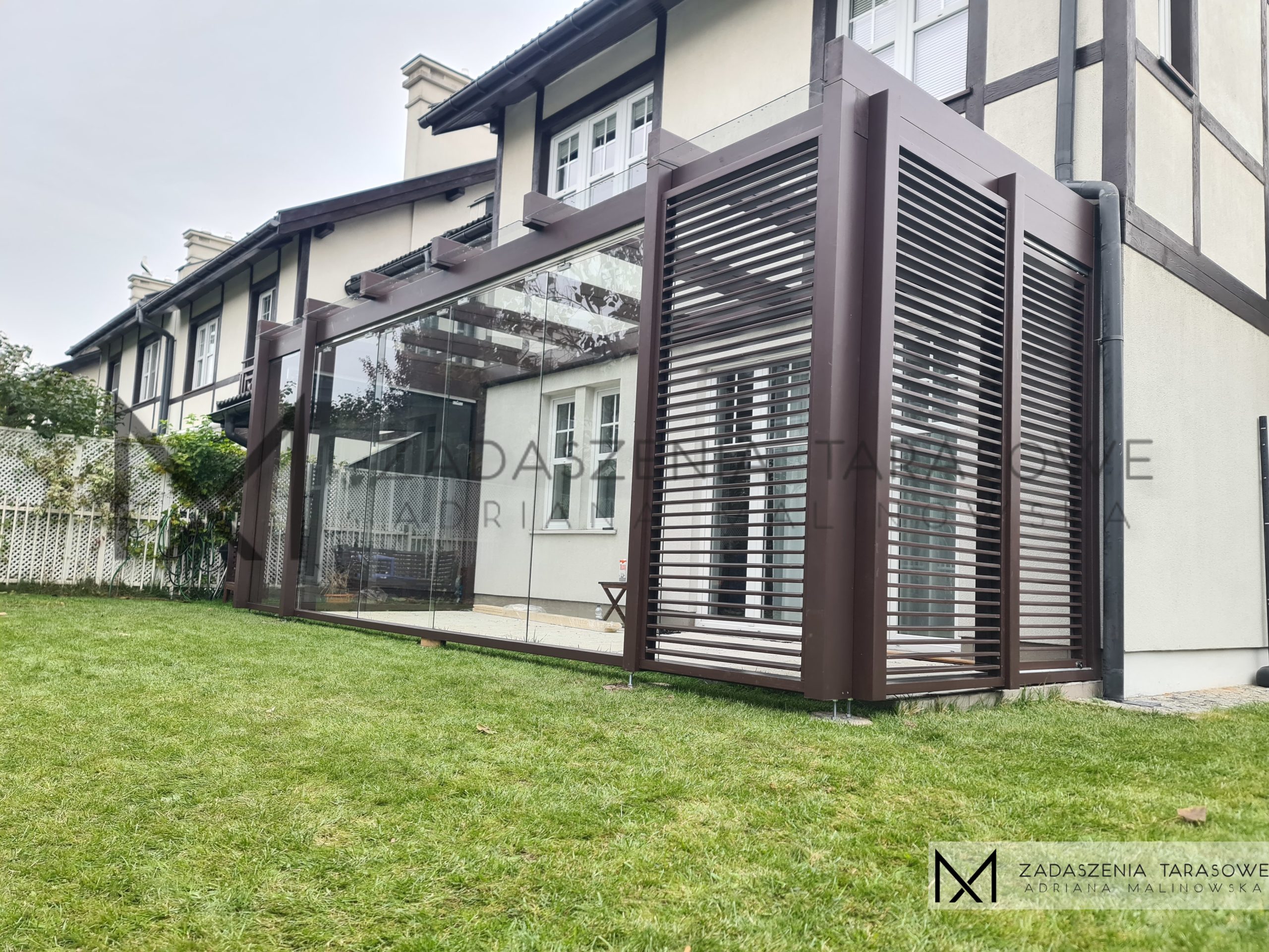 Ściany tarasu zostały wyposażone w szyby stałe oraz przesuwne, tworząc harmonijne połączenie z otoczeniem. To nie tylko estetyczne rozwiązanie, ale także funkcjonalne, które umożliwia regulację przepływu powietrza i dostęp do tarasu z każdej strony.