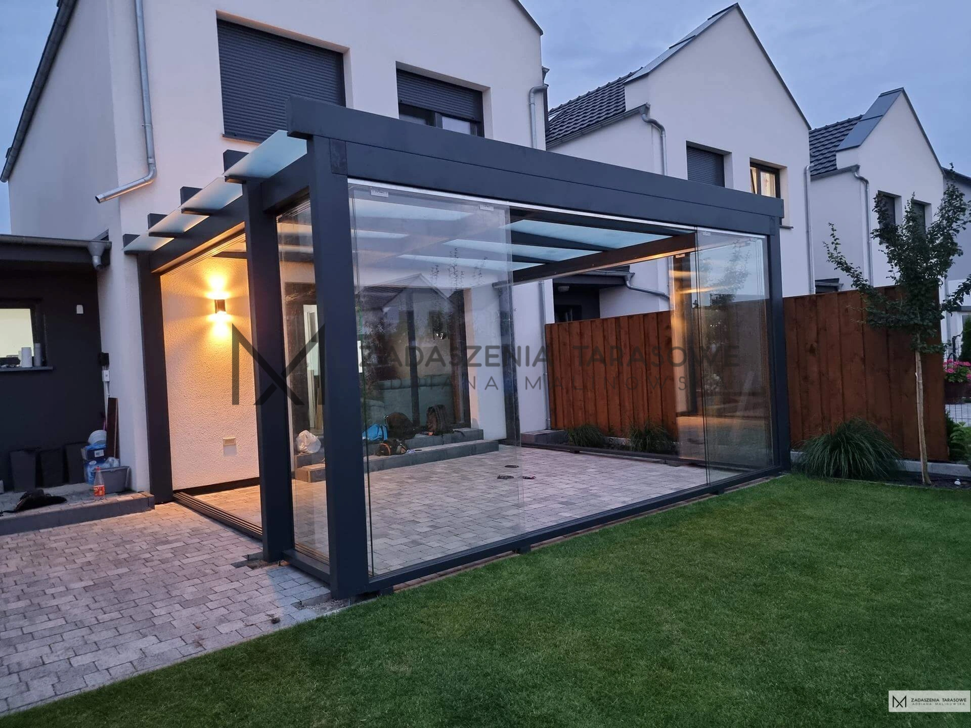 Szkielet wykonany został z drewna, które pokryliśmy ciemnoszarym laminatem. Barwa dopasowana jest do elewacji budynku oraz elementów wykończeniowych. Jednocześnie to ona sprawia, że nowoczesność i minimalizm stają się głównymi wyznacznikami tego tarasu zadaszonego ze szkłem ruchomym. Antracyt jest synonimem współczesnych aranżacji. Mimo swej ciemnej barwy jest też wizualnie lekki.