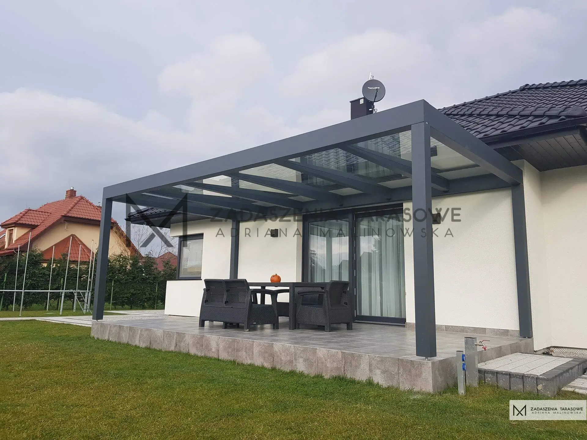 Dlatego zaproponowaliśmy szkielet konstrukcji z drewna pokrytego laminatem w kolorze RAL 7016. Antracytowa barwa doskonale pasuje do szarej elewacji budynku, stolarki okiennej oraz dachówek. Przełamuje też ciepły odcień płytek tarasowych. Laminat jest odporny na trudne warunki atmosferyczne, wilgoć oraz promieniowanie UV. Gwarantuje to zachowanie estetycznego, pierwotnego wyglądu przez dekady użytkowania.
