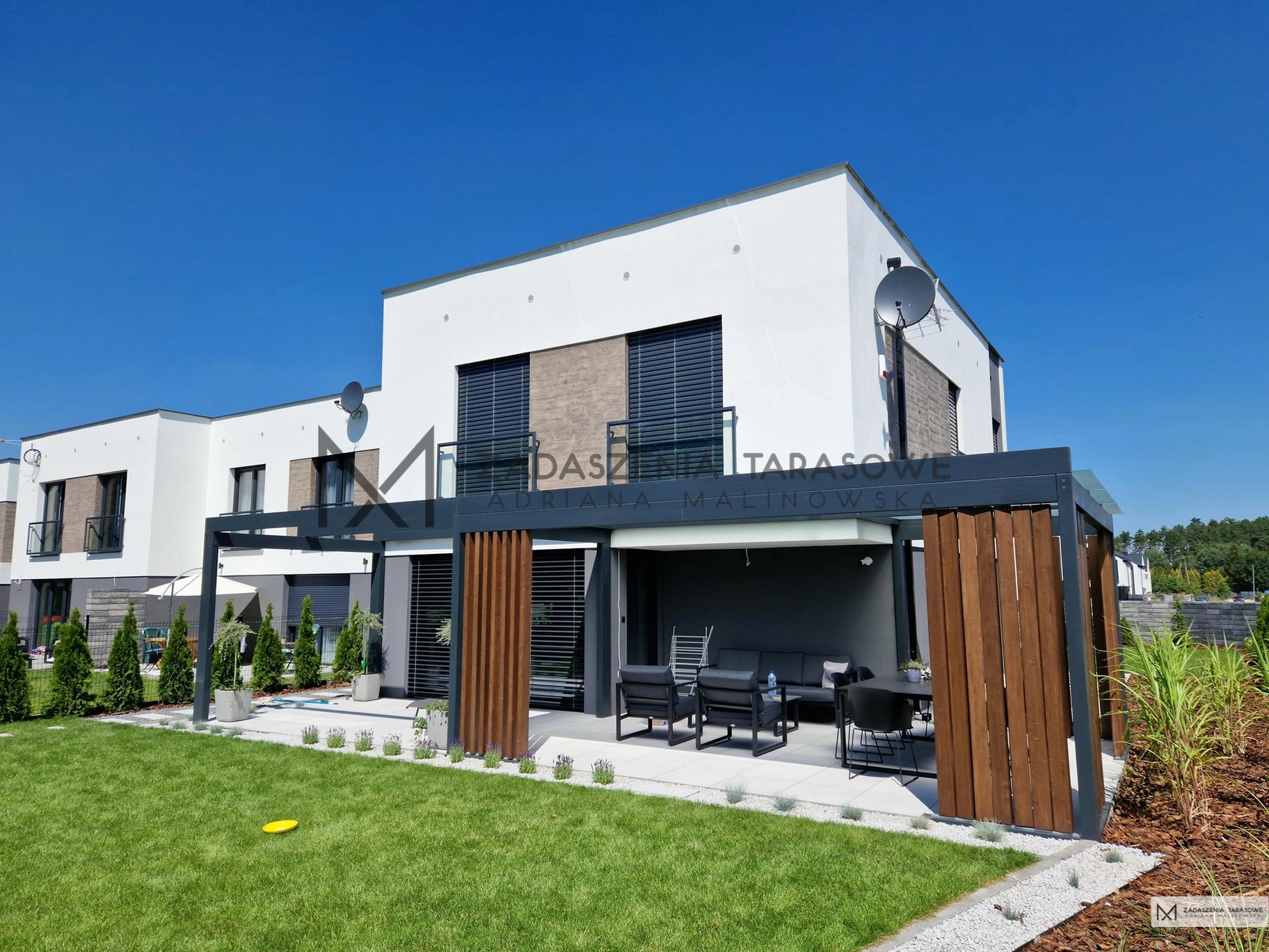 Ten projekt należy do pierwszej grupy. Jest doskonałym przykładem, jak zadaszenia tarasowe, nowoczesne z lamelami mogą podkreślać minimalistyczną kubaturę głównego budynku.