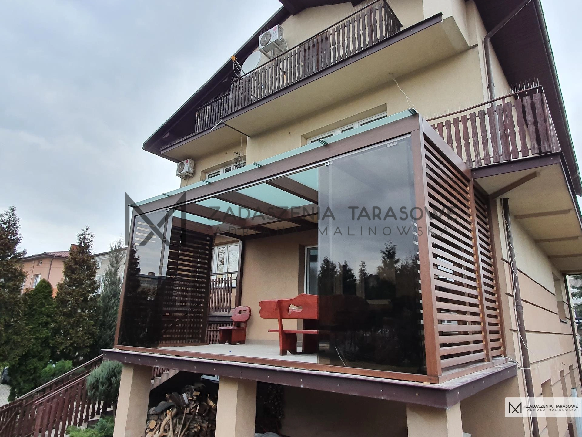 Zadaszenie tarasu jednospadowe spełniło te oczekiwania. Przestronna zabudowa zaczęła pełnić rolę drugiego salonu, z którego właściciele i ich goście mogą korzystać od wczesnej wiosny aż do pierwszych przymrozków . Konstrukcja jest eklektyczną kompozycją tradycyjnych rozwiązań z nowoczesnymi elementami. Dzięki temu, że szkielet konstrukcji wykonany został z drewna w ciepłym, czekoladowym odcieniu orzecha. Barwa pasuje do klasycznych balustrad przy pozostałych balkonach oraz na schodach. Jest tradycyjna, elegancka i ponadczasowa. Od frontu zabudowę zamknęliśmy przesuwnymi panelami ze szkła hartowanego. Dzięki temu zadaszenie balkonu szklane zwiększyło swoją funkcjonalność.