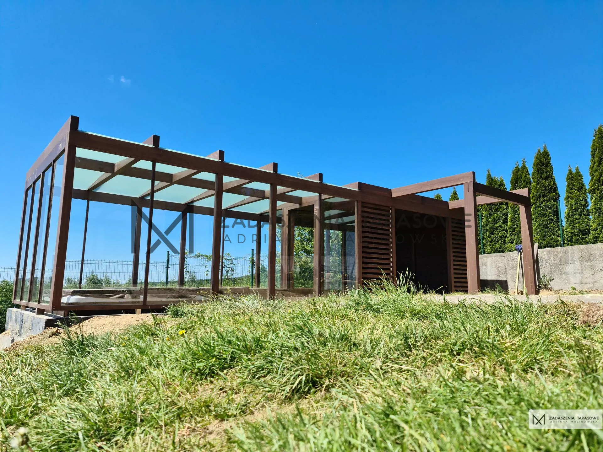 Przestronniejszą częścią jest ta nad basenem. Tu altana zadaszenie basenu wolnostojące pokryta stałymi ekranami z przezroczystego szkła hartowanego. Ten sam materiał wykorzystaliśmy na dachu.