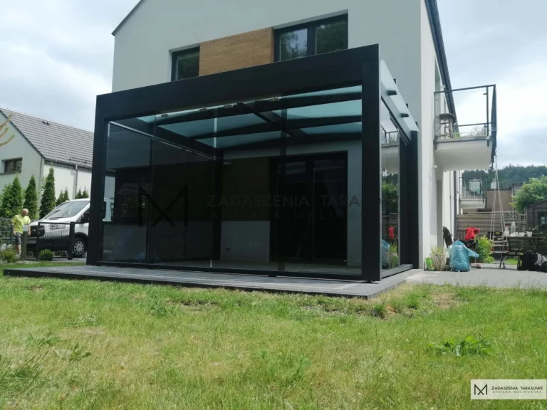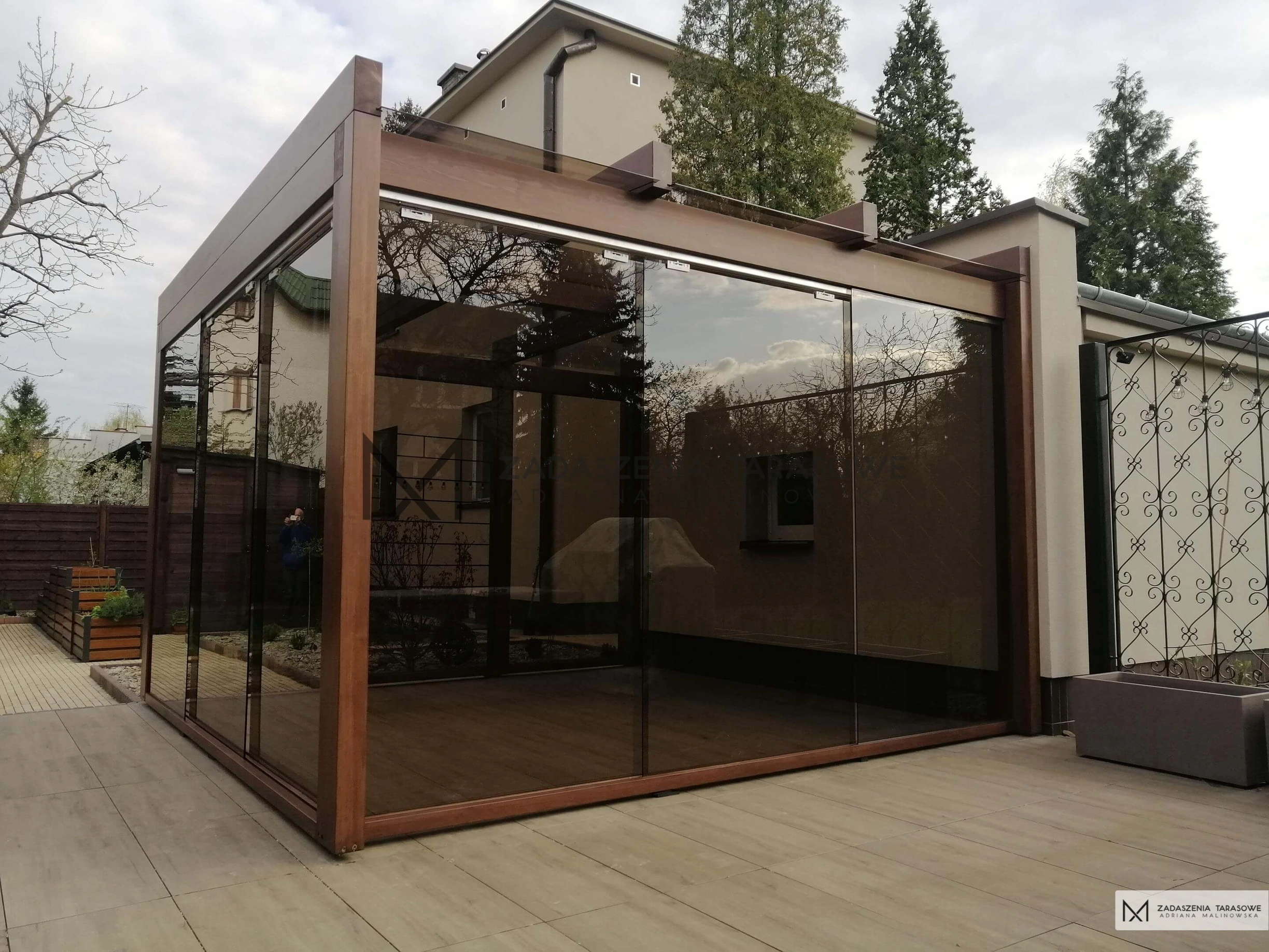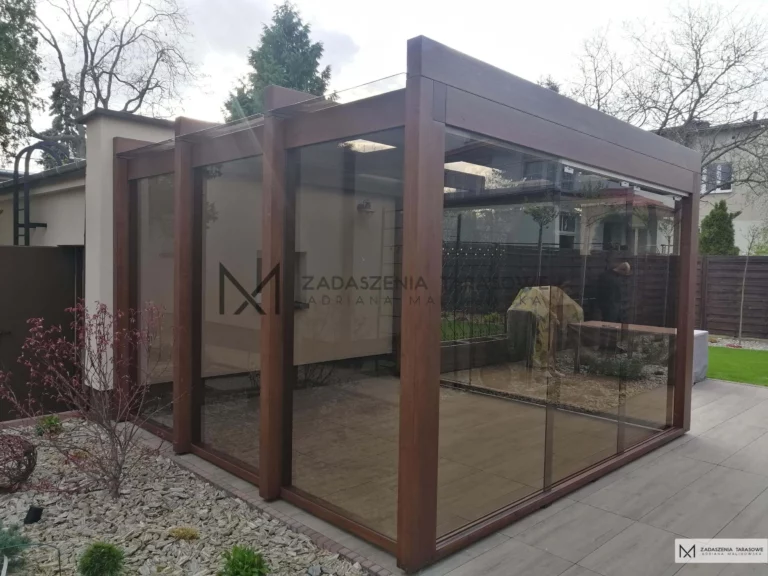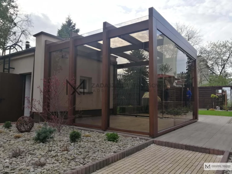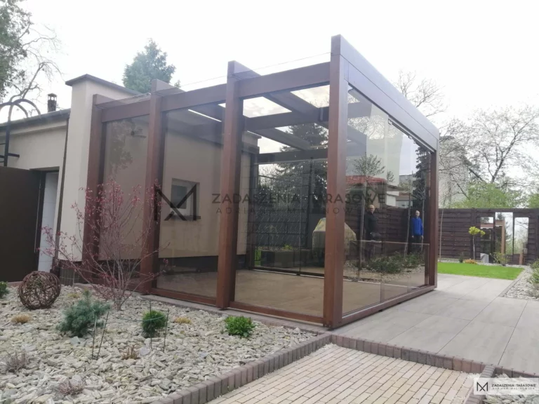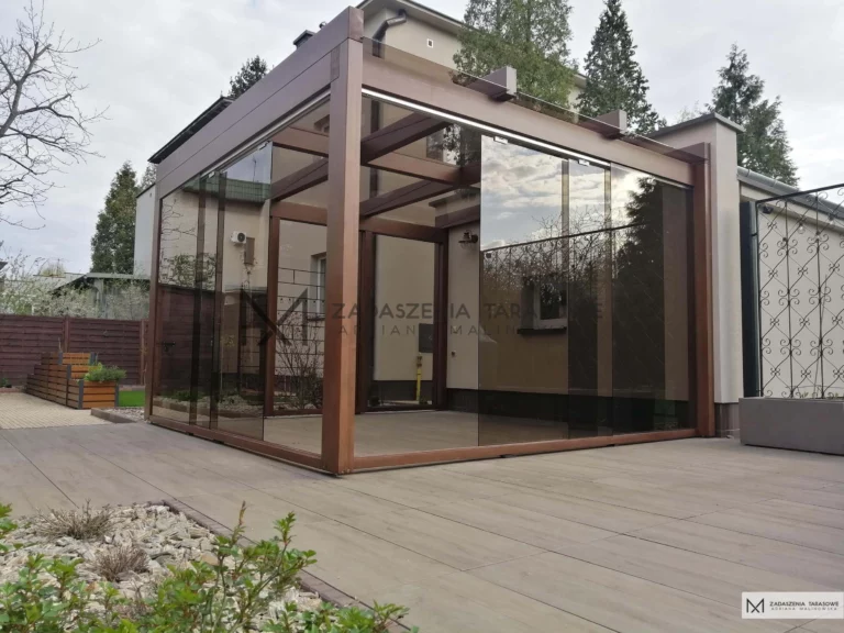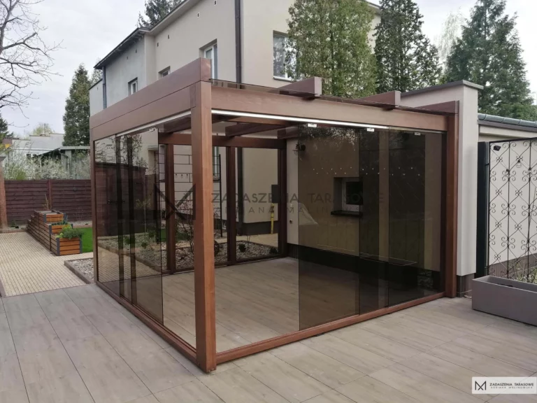 Szklane elementy zadaszenia to prawdziwy wisienka na torcie tego projektu. Brązowe szkło hartowane, odporne na zmienne warunki atmosferyczne. Nie tylko stanowi doskonałą ochronę przed deszczem, ale także działa jak filtr przeciwsłoneczny, tworząc przyjemne, stonowane światło. Przez to że, lewa ściana zadaszenia jest stała, zapewnia stabilność i strukturę. Dzięki temu, że na przedniej i prawej stronie znajdują się szyby przesuwne, umożliwione jest stworzenie przewiewnej atmosfery podczas gorących dni.