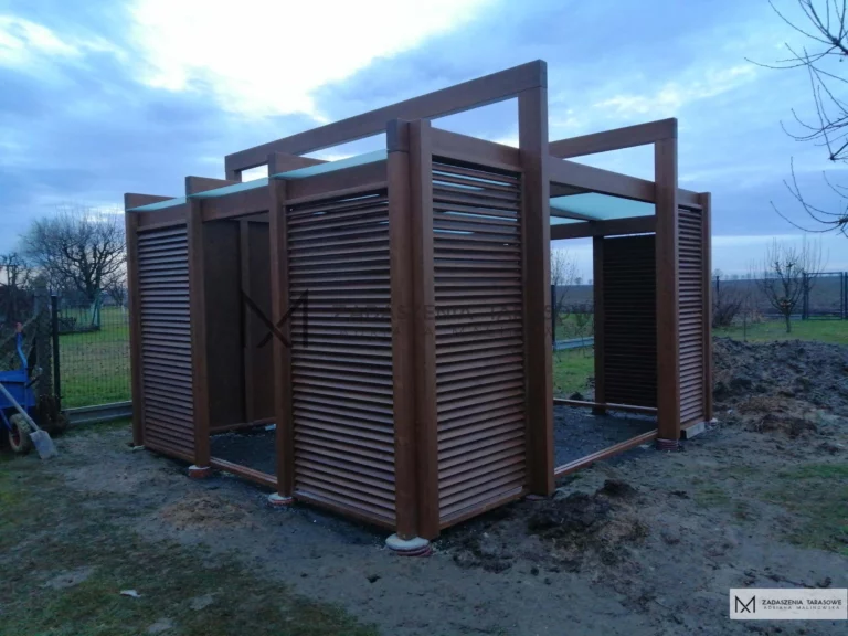 Wszystkie elementy konstrukcji są zgodnie ze sobą dobrane, tworząc harmonijny wygląd. Drewno klejone BSH w kolorze ciemnego orzecha nadaje elegancji i ciepła całej konstrukcji, łącząc ze sobą wszystkie elementy w spójną całość. To zadaszenie nie tylko chroni przed warunkami atmosferycznymi, ale także staje się estetycznym akcentem na każdej działce, zapraszając do spędzania czasu na świeżym powietrzu w luksusowym otoczeniu.
