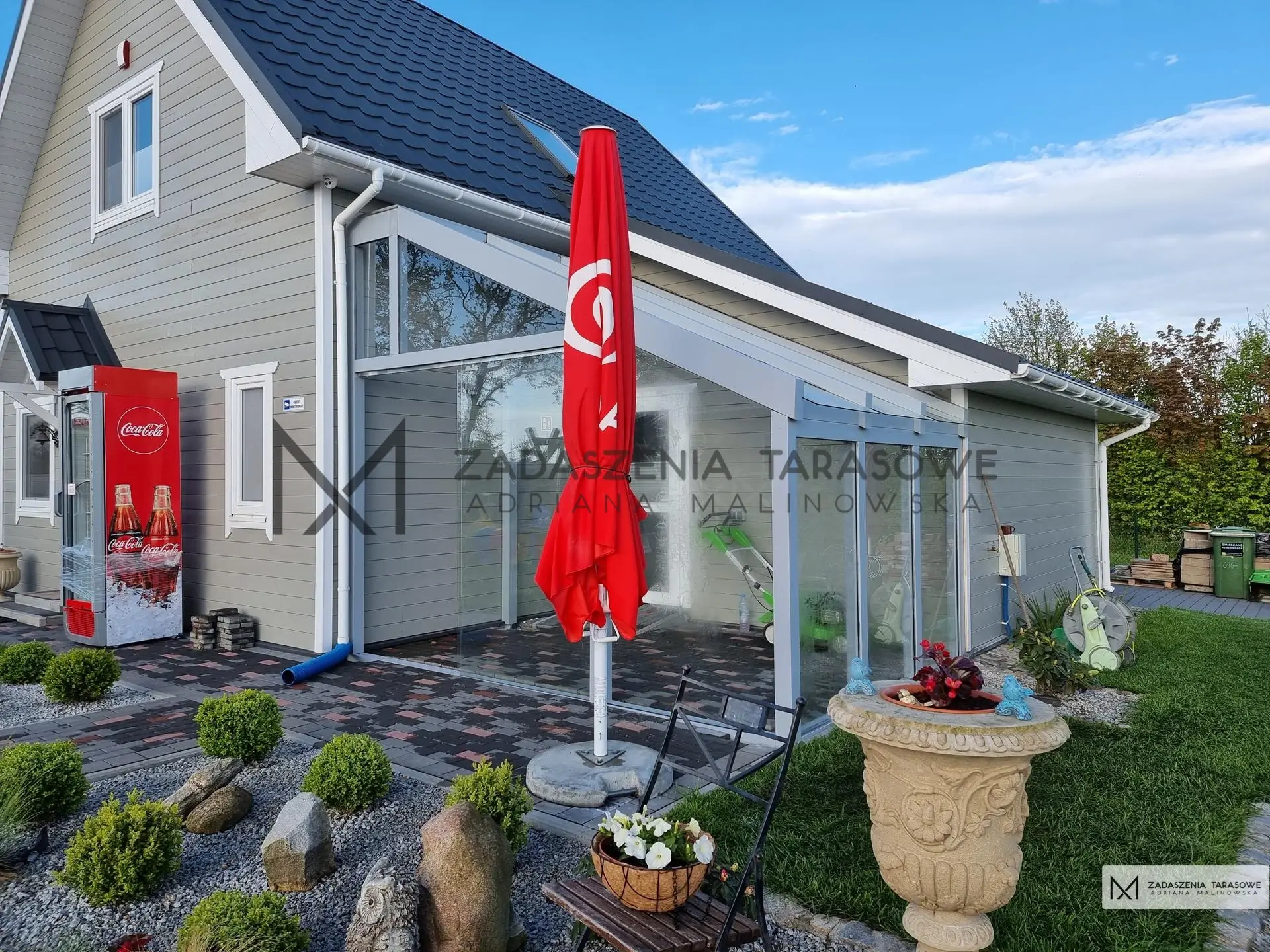 To funkcjonalne zadaszenie ganek nad drzwi ze szkła zlokalizowane jest w nietypowym miejscu. Nie jest to bowiem strefa wypoczynkowa, będąca przedłużeniem salonu, jak w typowych dla nas realizacjach. Znajduje się przy drzwiach bocznych prowadzących do garażu. Zajmuje całą “wnękę” stworzoną przez układ ścian. Ponadto, dom, do którego dopasowaliśmy zadaszenie ganek nad drzwi ze szkła, zbudowany został w charakterystycznym stylu marynistycznym. To nadało ton zadaszeniu. Jego szkielet wykonany jest z drewna w kolorze RAL 7040. Jasnoszary odcień idealnie komponuje się z zabudową i jest wizualnie lekki. W celu łatwej identyfikacji naszym realizacjom nadajemy numery. Zyskało go także to zadaszenie ganek nad drzwi. Numer seryjny umieściliśmy na zewnątrz, gdyż komponuje się z wyglądem i formą zabudowy. Lokalizację tabliczki zawsze uzgadniamy z klientem.