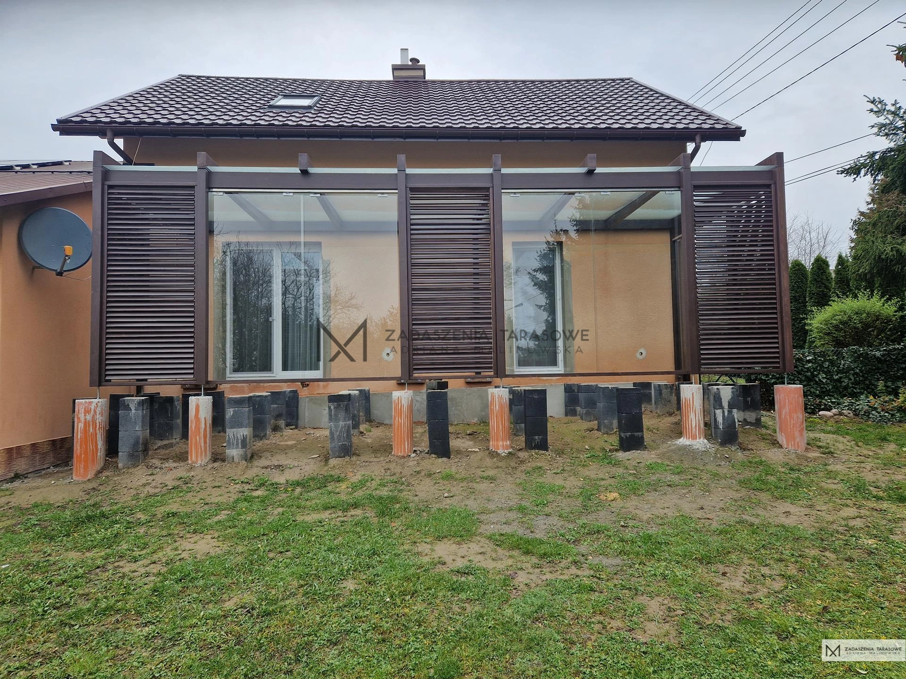 W ten oto sposób właściciele zyskali przestronną przestrzeń wypoczynkową w ogrodzie, z której mogą podziwiać urokliwe wschody słońca nawet w chłodny, zimowy poranek. Różne rozwiązania chodziły nam po głowie podczas projektowania tej konstrukcji. Podłoga z termo sosny do której pierwotnie chcieliśmy nawiązać stylistyką, poprzez zastosowanie pionowych lamel. Takie lamele jak w projekcie Zadaszenie nowoczesne z lamelkami. Jednak byłoby to zbyt oczywiste. Ponadto w całej zabudowie mało funkcjonalne. Postawiliśmy na żaluzje. Był to strzał w przysłowiową dziesiątkę.