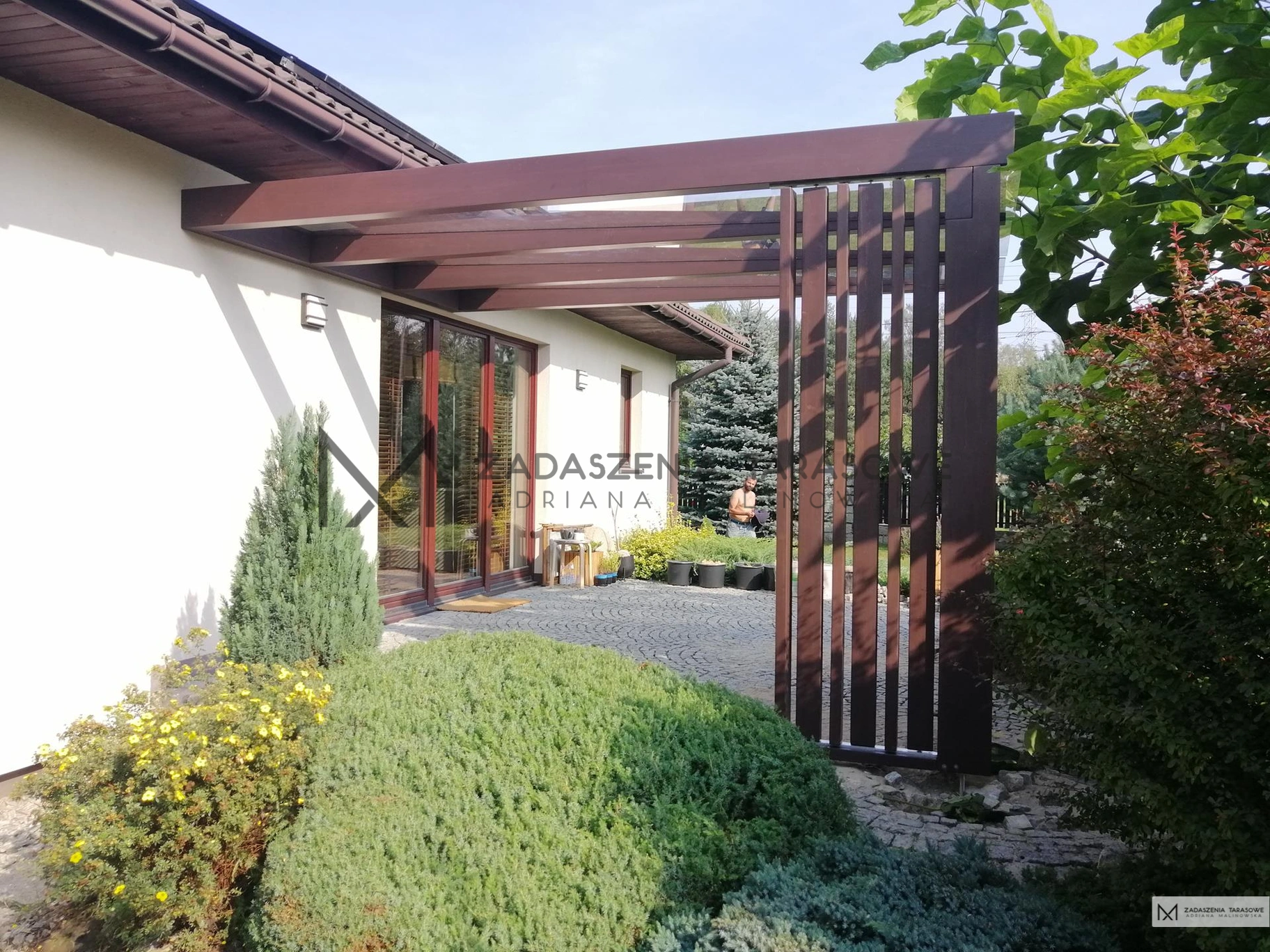 Szkielet powstał z drewnianych belek w czekoladowym odcieniu dopasowanym do stolarki okiennej i drzwiowej budynku, stropu oraz dachówki. Gładka faktura bez intensywnych, kontrastowych słojów i sęków nadała szkieletowi minimalistyczny charakter. W jednym rogu umieściliśmy ruchome, pionowe lamele. Deski obracają się wokół podstawy. Można je całkowicie zamknąć lub otworzyć. Funkcja ta jest przydatna w słoneczne popołudnia, gdy słońce operuje tu intensywniej. Jednak przede wszystkim zadaszenie tarasu nowoczesne z lamelkami zyskuje dzięki nim urok i nietuzinkowy, indywidualny wygląd.