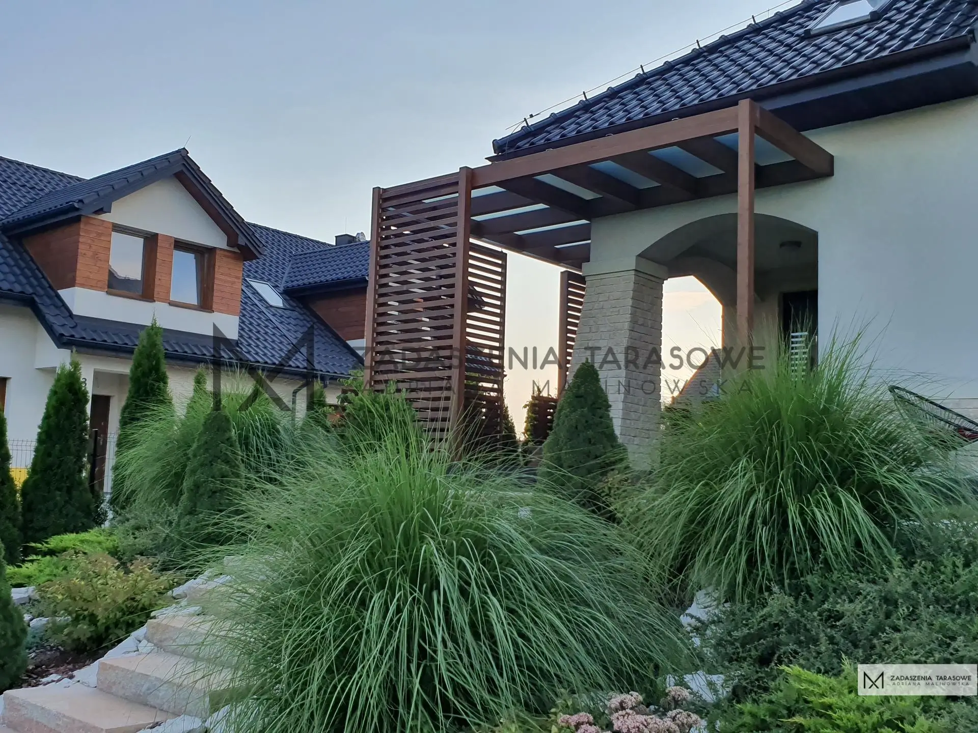 W tej realizacji minimalizm i tradycja idą ze sobą pod rękę. Uzupełniają się, tworząc ciekawe zadaszenie pergoli tarasowej narożnej. Zabudowa powiększyła taras, zorganizowała przestrzeń w ogrodzie i stała się kropką nad “i” w jego aranżacji. Powstało przestronne miejsce nie tylko do odpoczynku i wyciszenia, a także do gwarnych spotkań z przyjaciółmi. W projekcie dominuje drewno. Szkielet wykonany został z belek w ciepłym kolorze orzecha. Aby zadaszenie pergoli tarasowej w ogrodzie wyglądało naturalnie, każdy element był ręcznie szczotkowany. Ten zabieg spowodował, że sęki i słoje są kontrastowe i wyraziste.