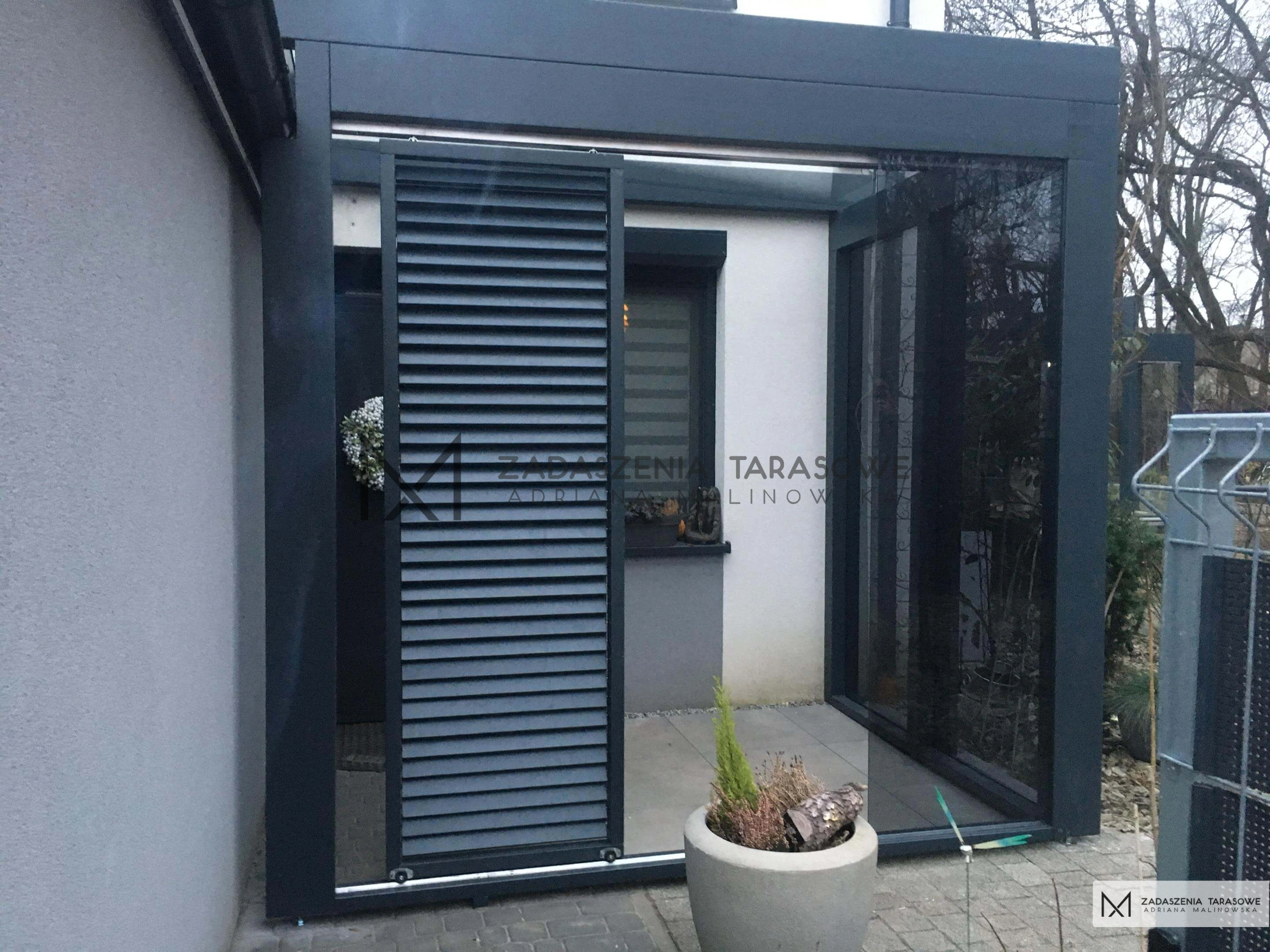 Bezpieczne Materiały: W dachu zadaszenia znajduje się grafitowe szkło bezpieczne typu Parsol, które nie tylko chroni przed promieniowaniem UV, ale także dodaje elegancji. W ścianie bocznej zastosowaliśmy dwie szyby stałe grafitowe, oczywiście hartowane i bezpieczne. Na przedniej ścianie znajduje się jedna szyba grafitowa stała oraz przesuwna żaluzja, co daje kontrolę nad ilością światła wpadającego do wnętrza.