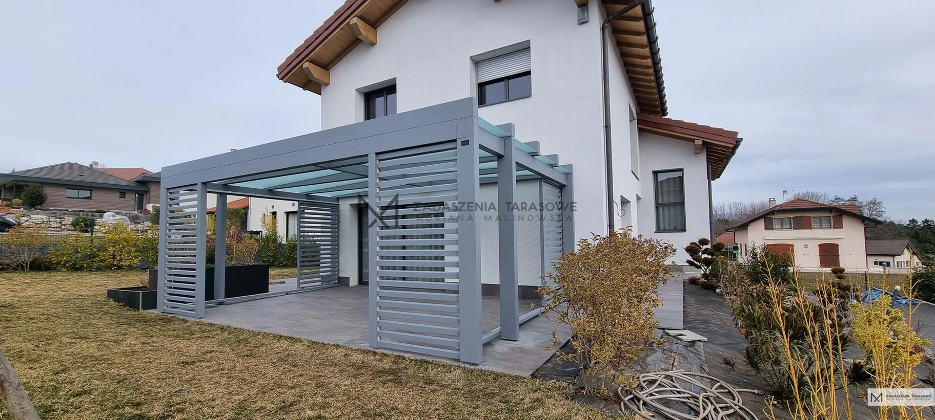 Tak jest w przypadku tej zabudowy, która doskonale spełnia życzenia właścicieli. Marzyli oni o otwartej, a jednocześnie zasłoniętej przestrzeni. Ich wyśnione zadaszenie na taras drewniane miało dać im możliwość odpoczynku w ciepłe dni nawet przy delikatnym deszczu. Jednocześnie nie mogło zasłaniać fantastycznych widoków na francuskie Alpy.