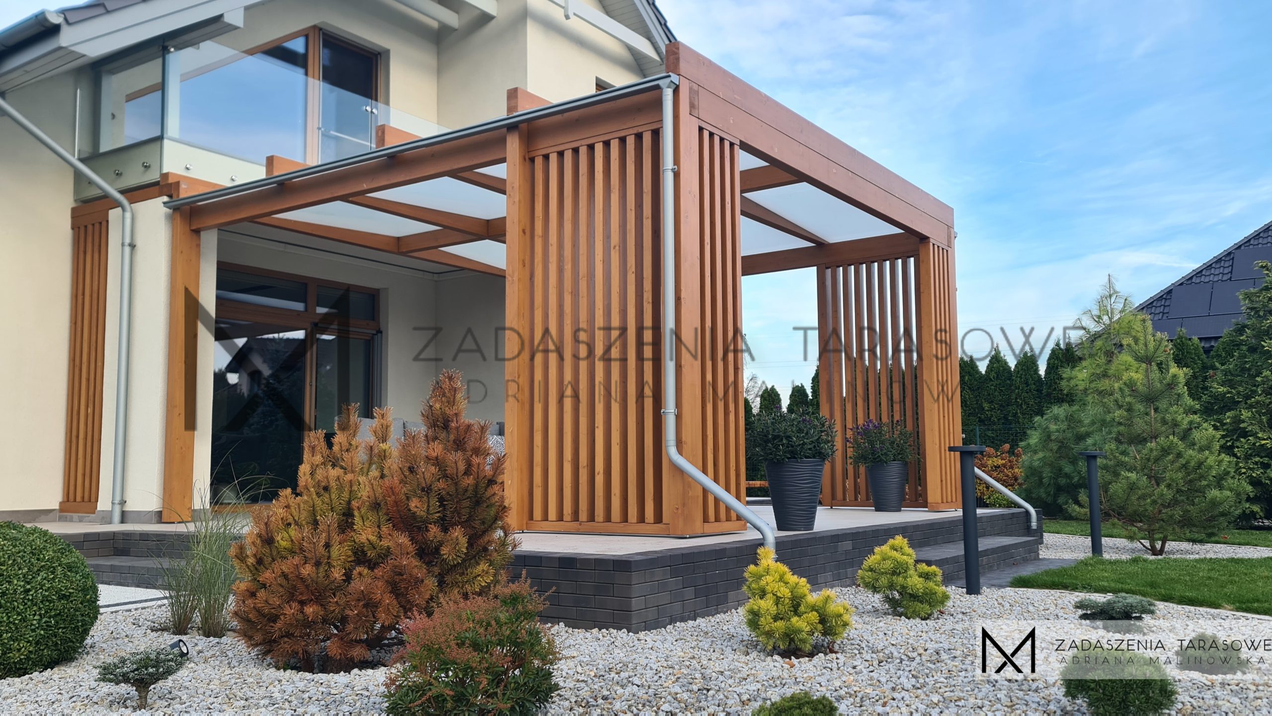 Zadaszenie zostało wyposażone w lamelki w zabudowie stałej, które można dostosować do indywidualnych potrzeb inwestora. To nie tylko element dekoracyjny, ale także funkcjonalny, umożliwiający regulację ilości światła i cienia w zależności od warunków atmosferycznych.