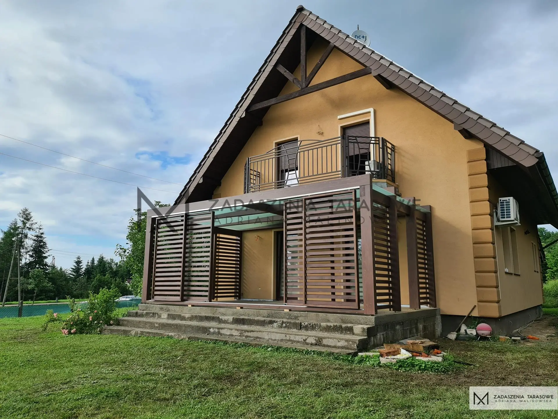 Zadaszenie tarasu rozsuwane będzie doskonałą “kropką nad “i” w aranżacji budynku, jeśli odpowiednio dobierze się wszystkie jego elementy. Tak jak w tej realizacji. Dzięki kolorystyce zabudowa stapia się z domem, tworząc oazę do odpoczynku w otoczeniu wypielęgnowane zieleni. Szkielet konstrukcji powstał z drewna w ciepłym, czekoladowym odcieniu orzecha. Barwa idealnie pasuje do elementów wykończenia domu, takich jak stolarka okienna, drzwiowa i fragmenty ozdobne dachu. Drewniana struktura Zadaszenie tarasu pod balkonem oddaje rustykalny styl zabudowy.